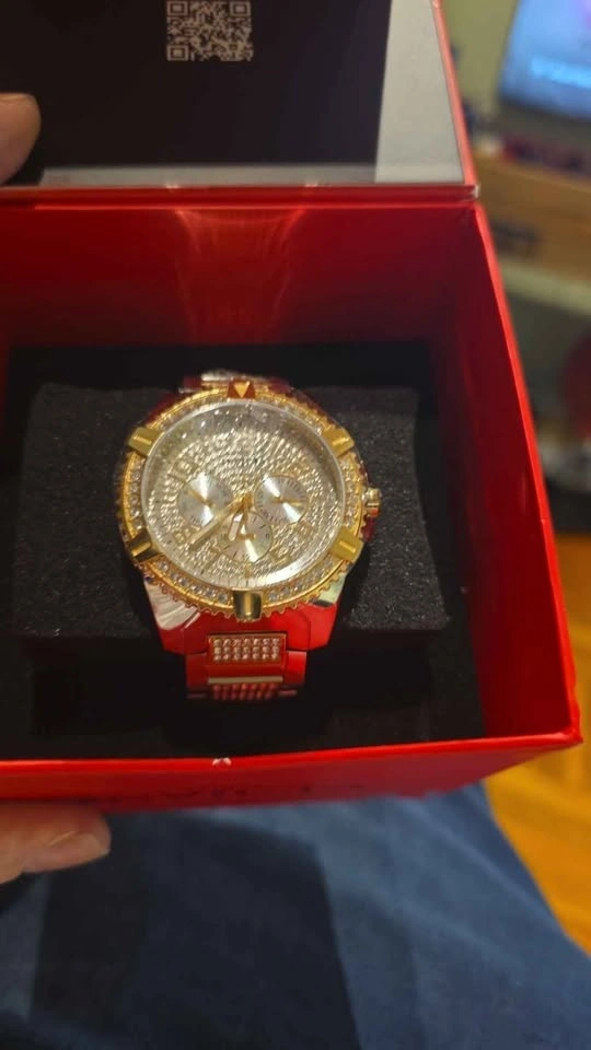 Sparkly Invicta Celestial men's watch, model 48562. This watch has an elegant design with a significant number of crystals. Gold-tone casing and a two tone band. Three subdials on the face. Comes in original red box.