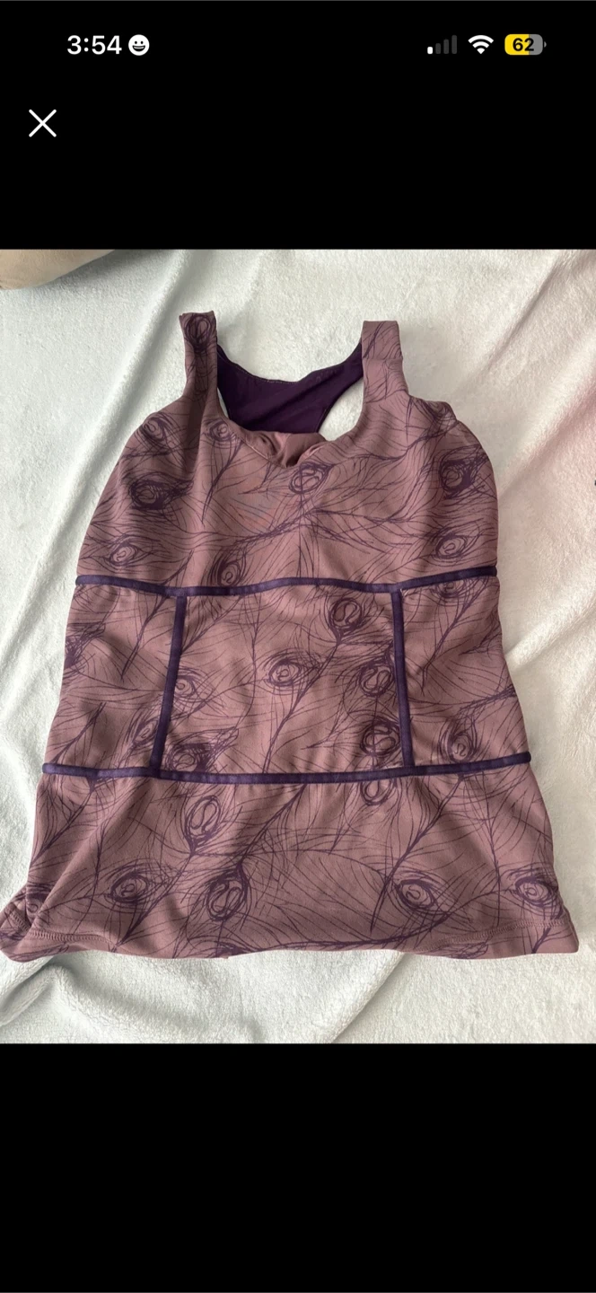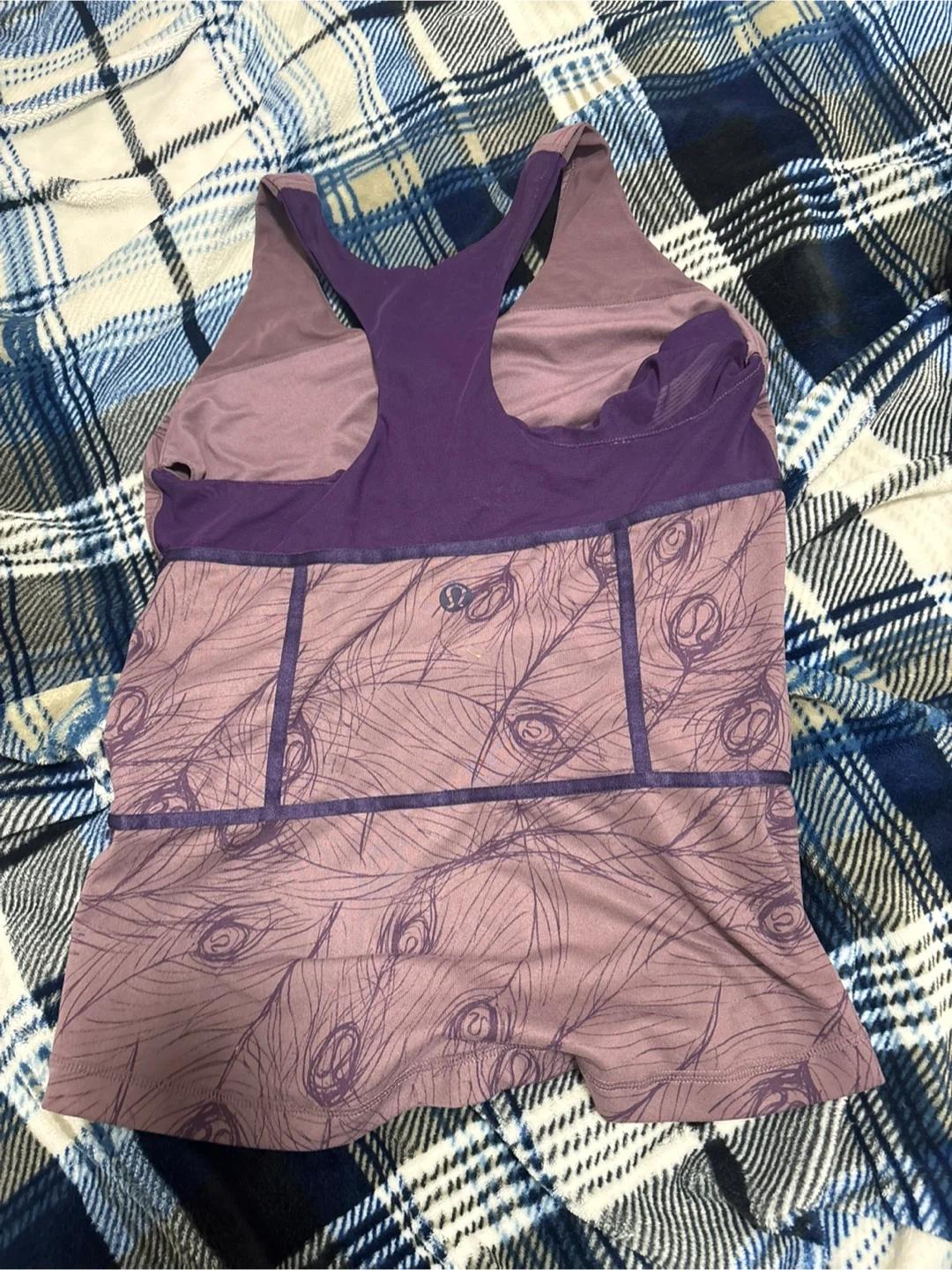 This Lululemon tank top has a fun feather print. It's made with breathable fabric, perfect for workouts. The racerback design offers good support. Pick up cash only
