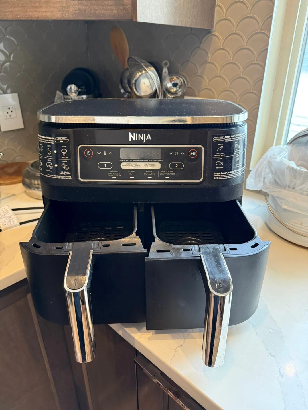 This is a Ninja Dual Zone air fryer with two baskets. It's black and has multiple cooking functions including air fry, roast, reheat, and dehydrate. It's great for cooking different foods at once!