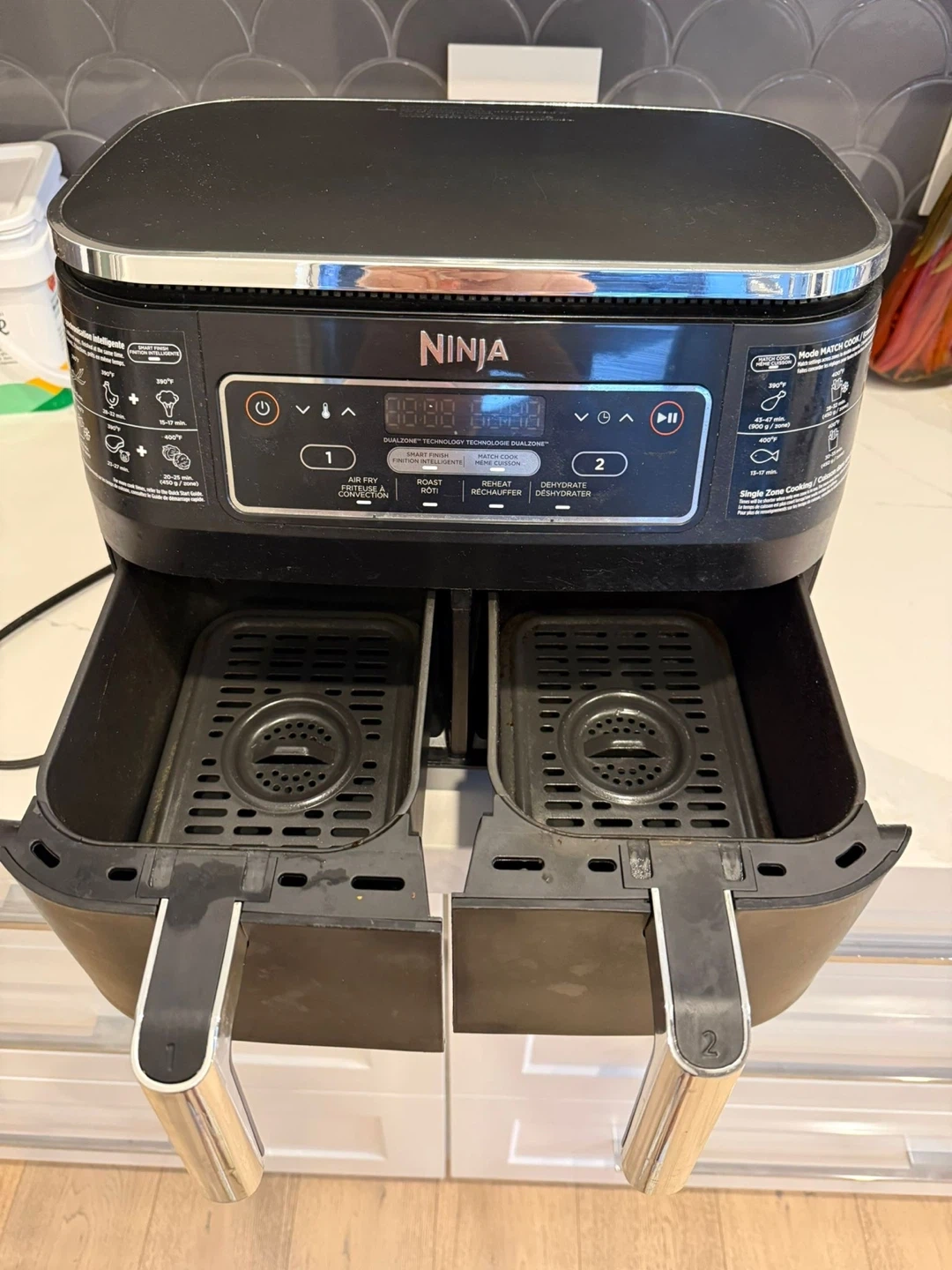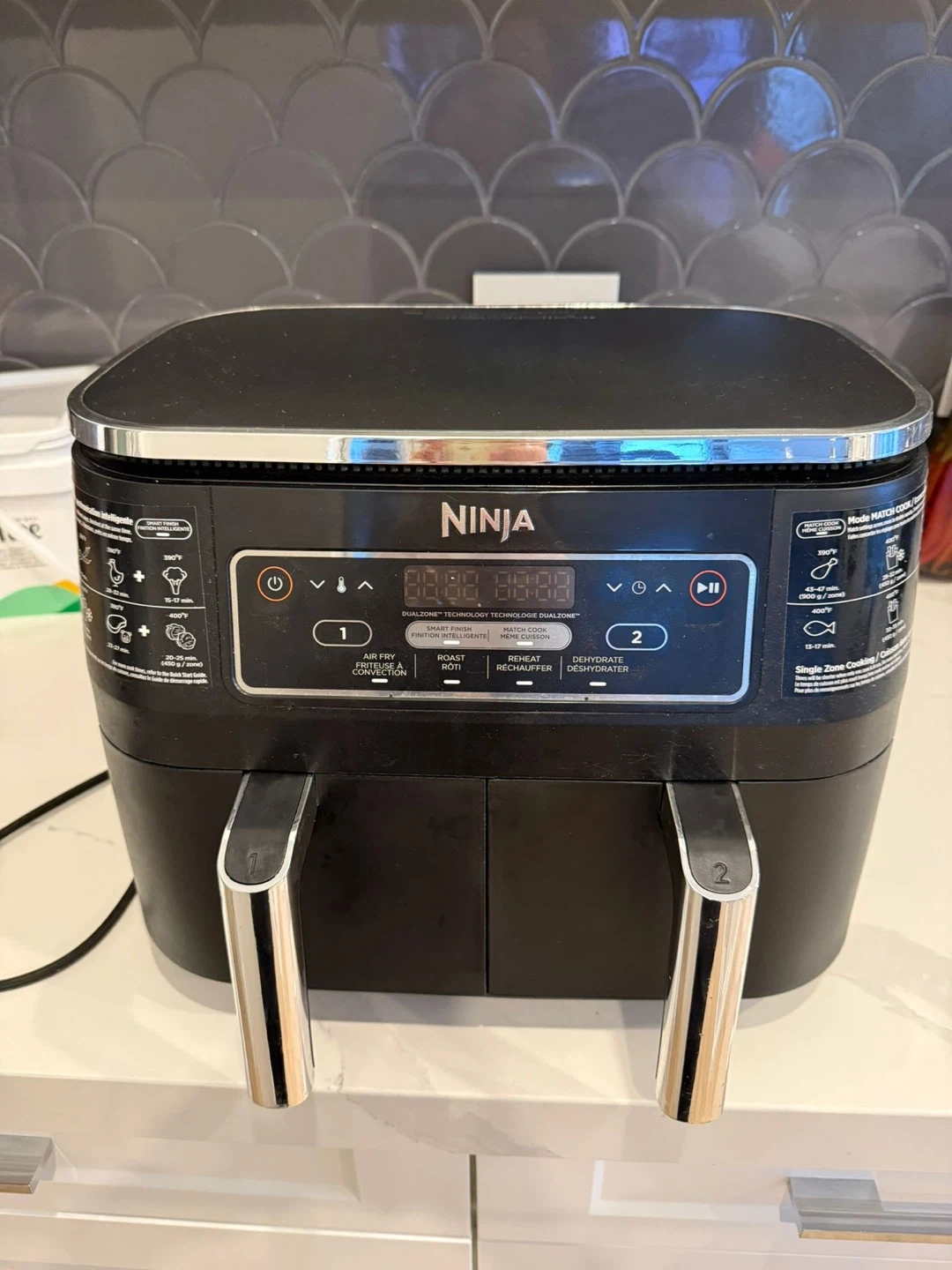 This is a Ninja Dual Zone air fryer with two baskets. It's black and has multiple cooking functions including air fry, roast, reheat, and dehydrate. It's great for cooking different foods at once!