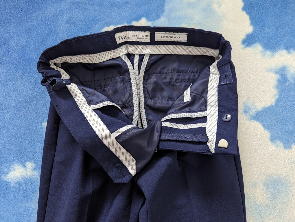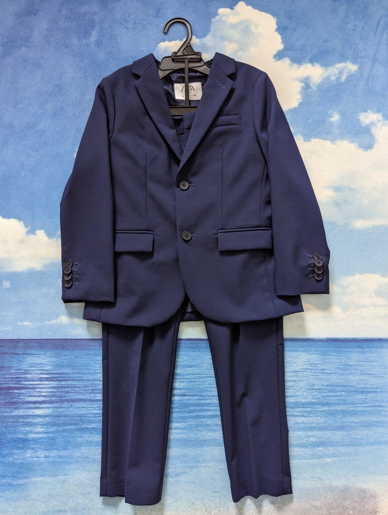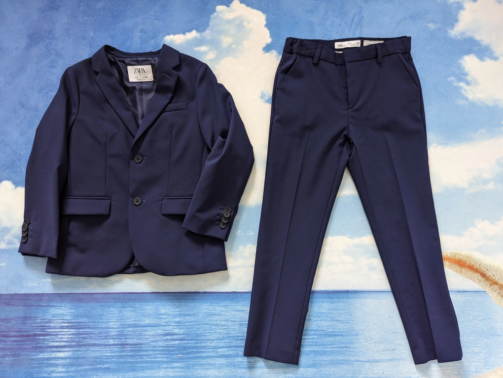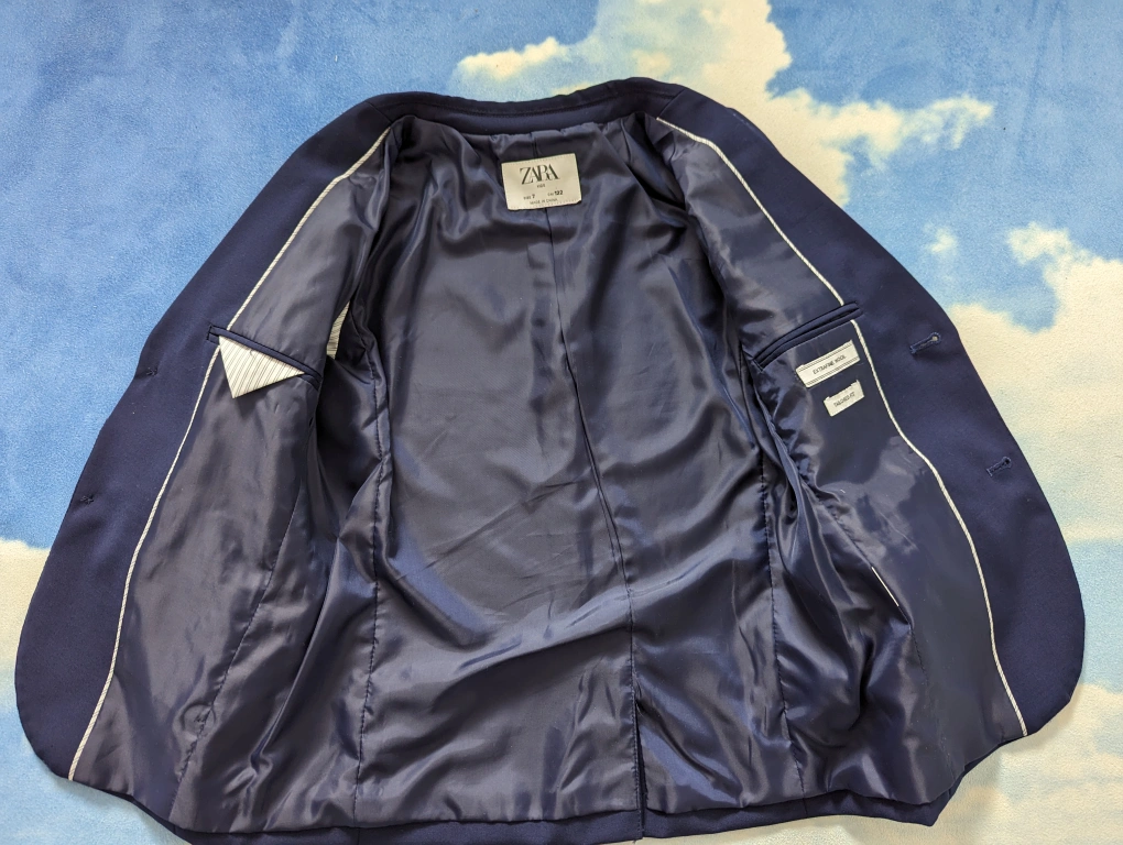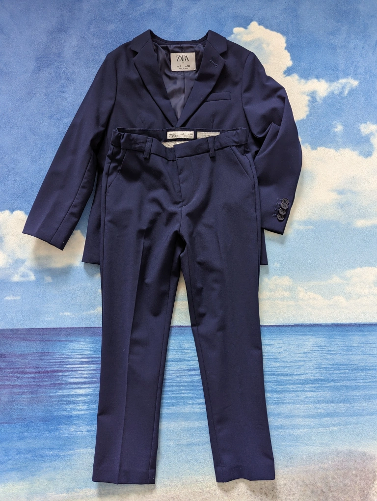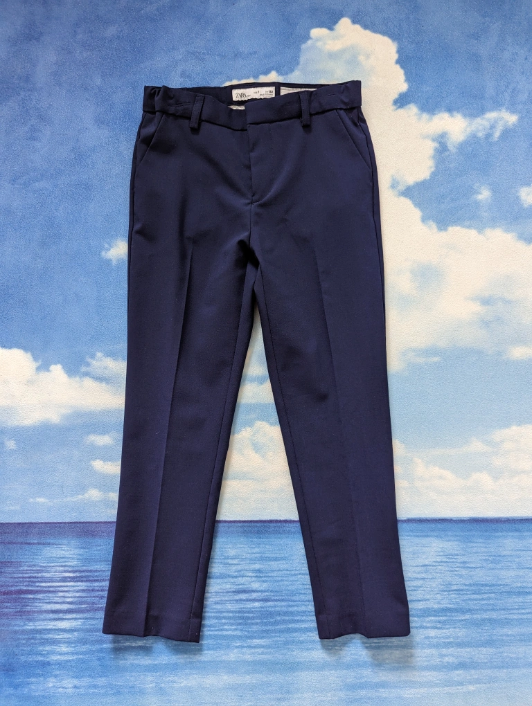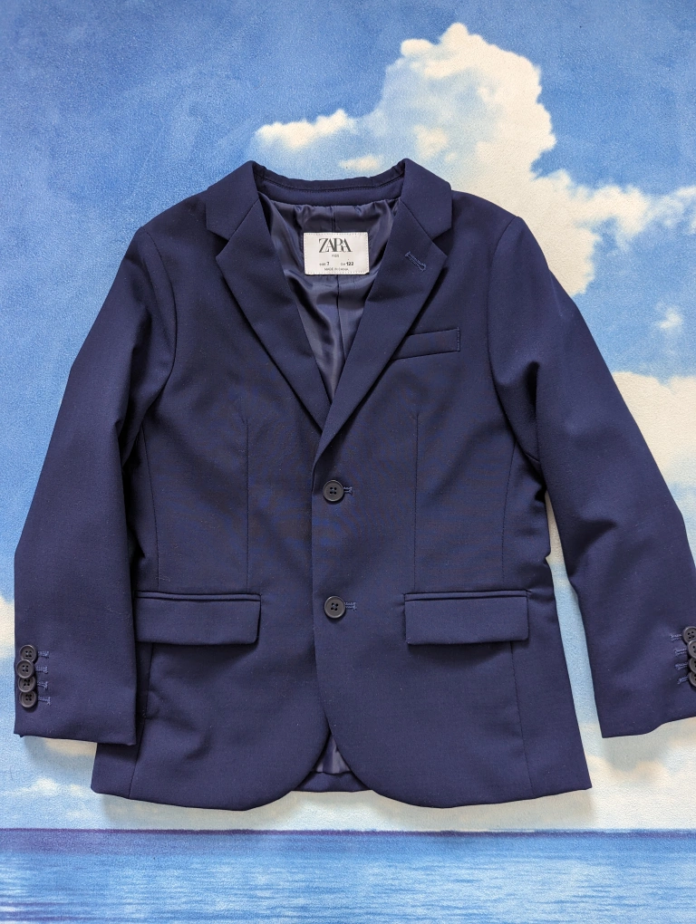 ZARA Kids Size 7 Navy Blue Wool Textured Suits, like new without tags. Used twice, no stain no tear, great condition, adjustable waistband for Boys 6-7Y, 122cm slim fit. Extrafine Wool. Tailored fit. Was over $160 for the set.