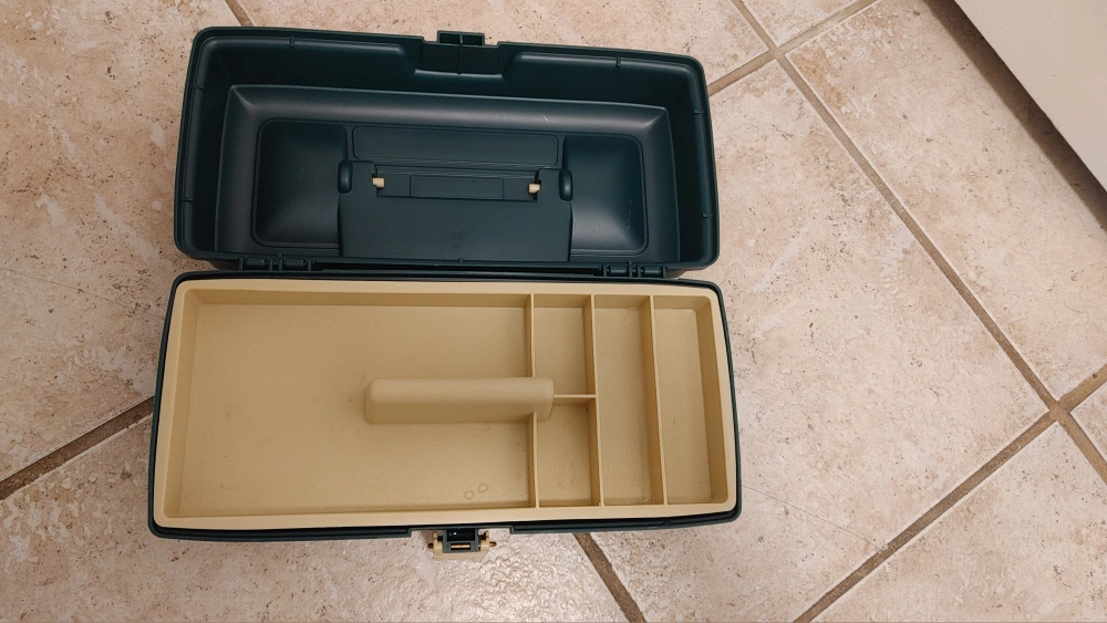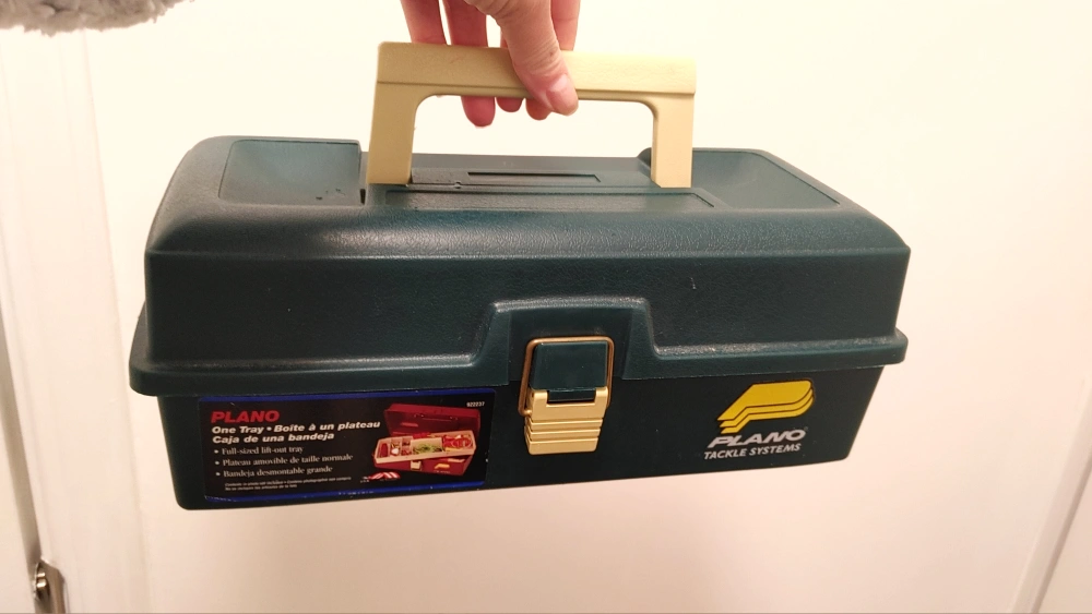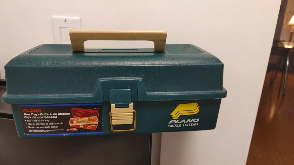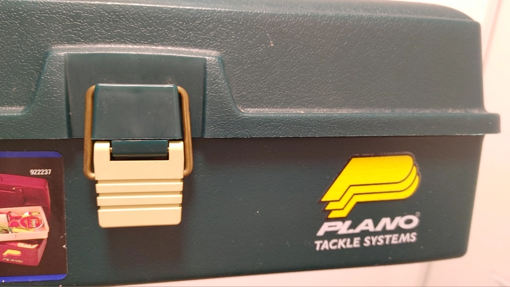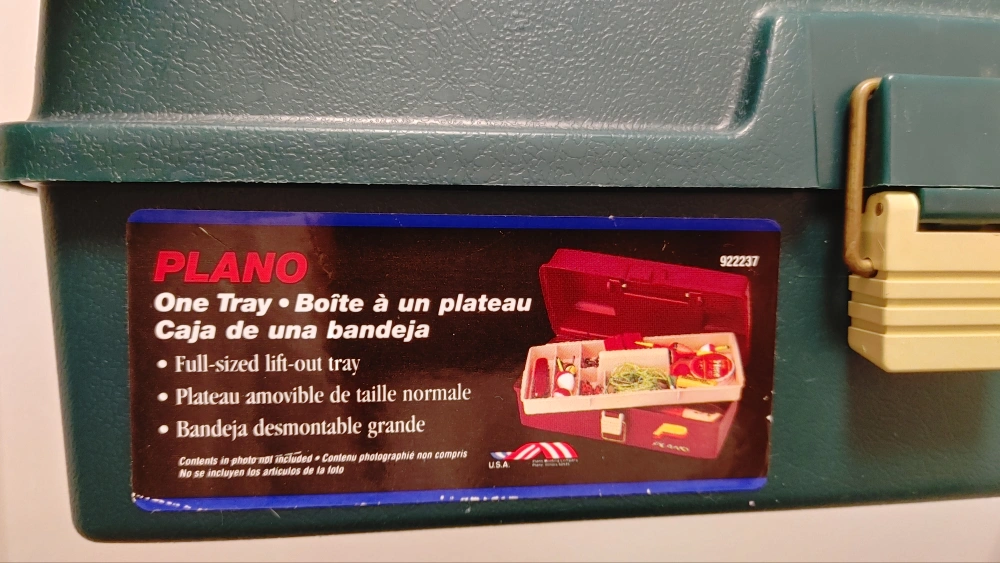 This is a Plano One Tray tackle box with a full-sized lift-out tray. It's perfect for organizing fishing gear. Constructed from durable plastic.