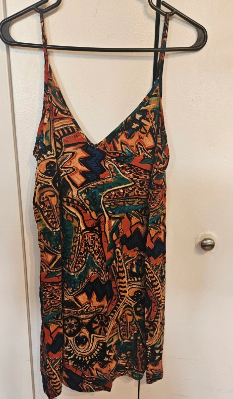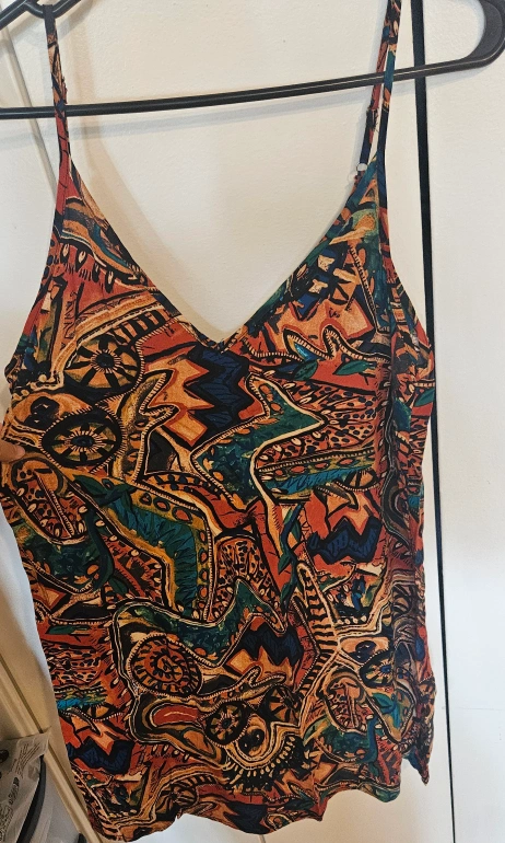 Here's a fun patterned top! It's in great shape and ready for a new home. The colours are really vibrant and the pattern is super unique, perfect for adding a pop to your wardrobe. runs longer