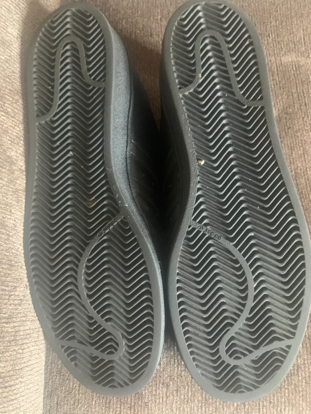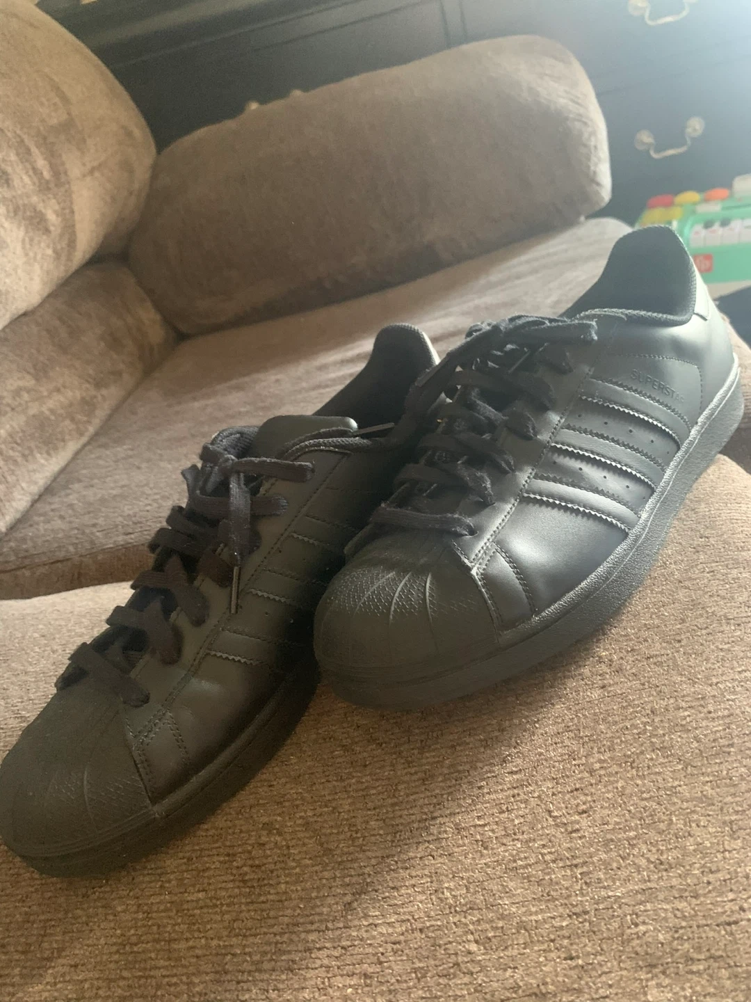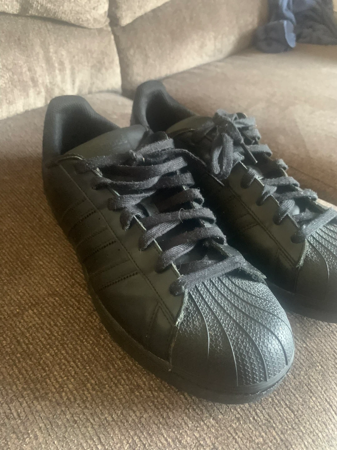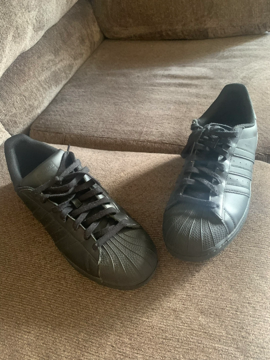 Selling a pair of Adidas Superstar sneakers in all black. They have the classic three stripes on the side and the iconic shell toe. They're in good condition and ready for a new owner!