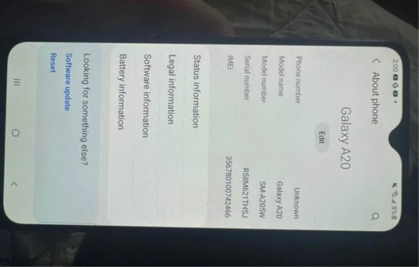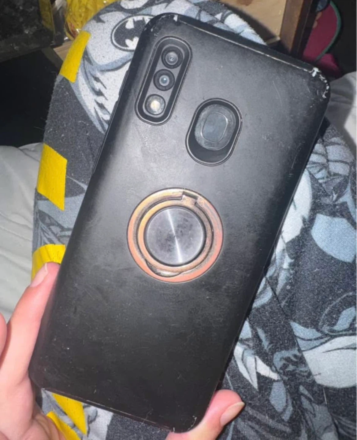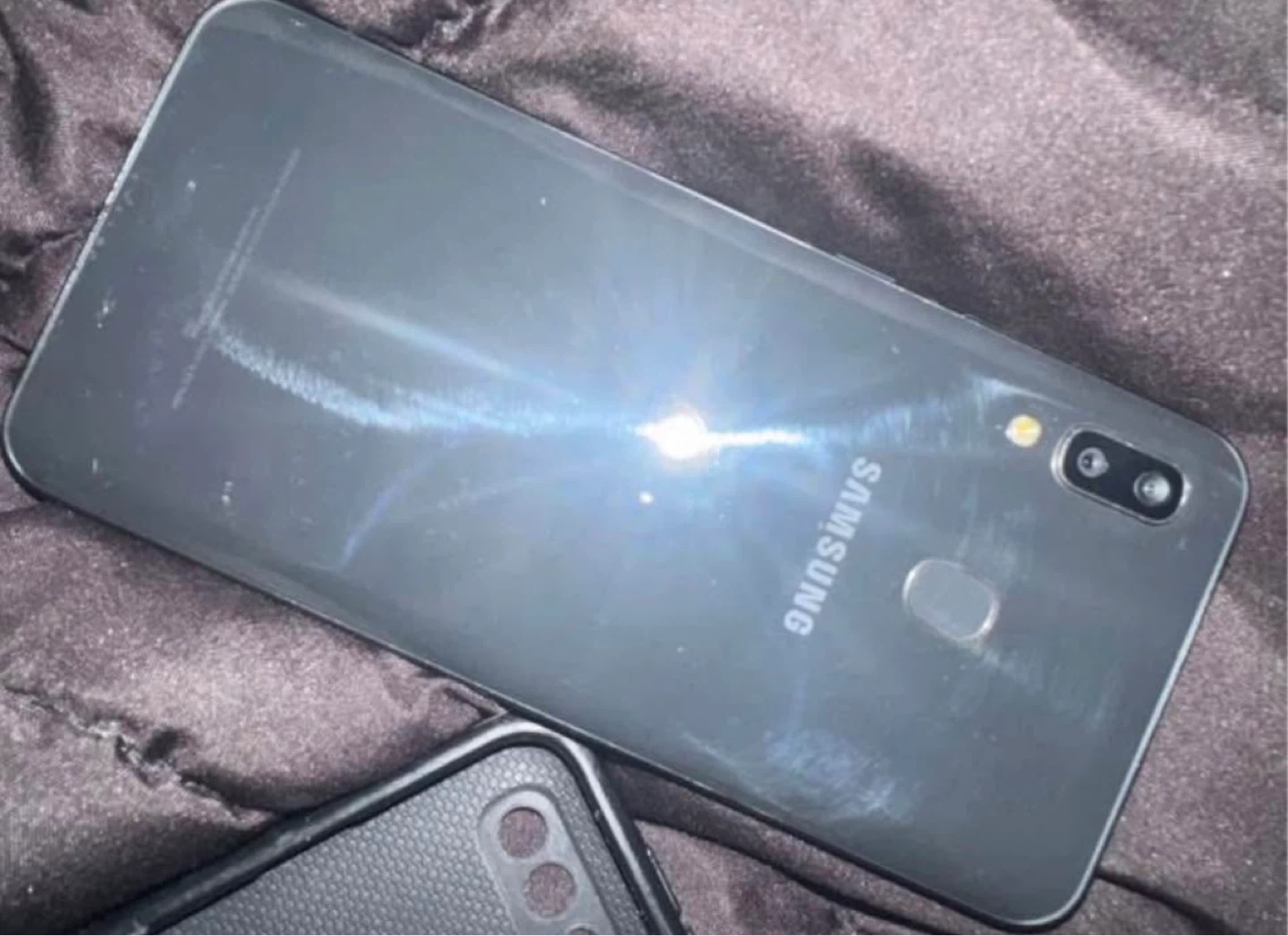 Samsung Galaxy A20 smartphone, model SM-A205W. It's a black phone with a rear fingerprint sensor. Includes a phone ring holder attached to the back. Few small scratches on back that are barely noticeable