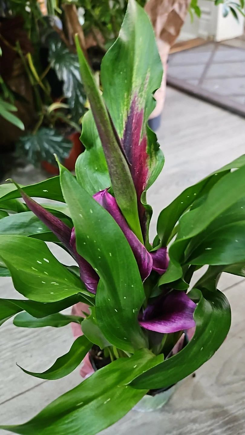 A beautiful Calla Lily plant with deep purple blooms and green, speckled leaves. It's ready to add a touch of elegance to your home. This plant thrives in bright, indirect light. Water when the top inch of soil feels dry.