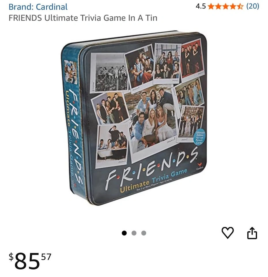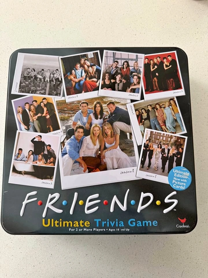 Paid $95. A Fun FRIENDS Ultimate Trivia Game for fans of the show! This Ultimate Edition has 1000+ questions and comes with picture cards! Great for testing your FRIENDS knowledge. Includes the game board, trivia cards, pawns, and a die. For 2 or more players, ages 10 and up.