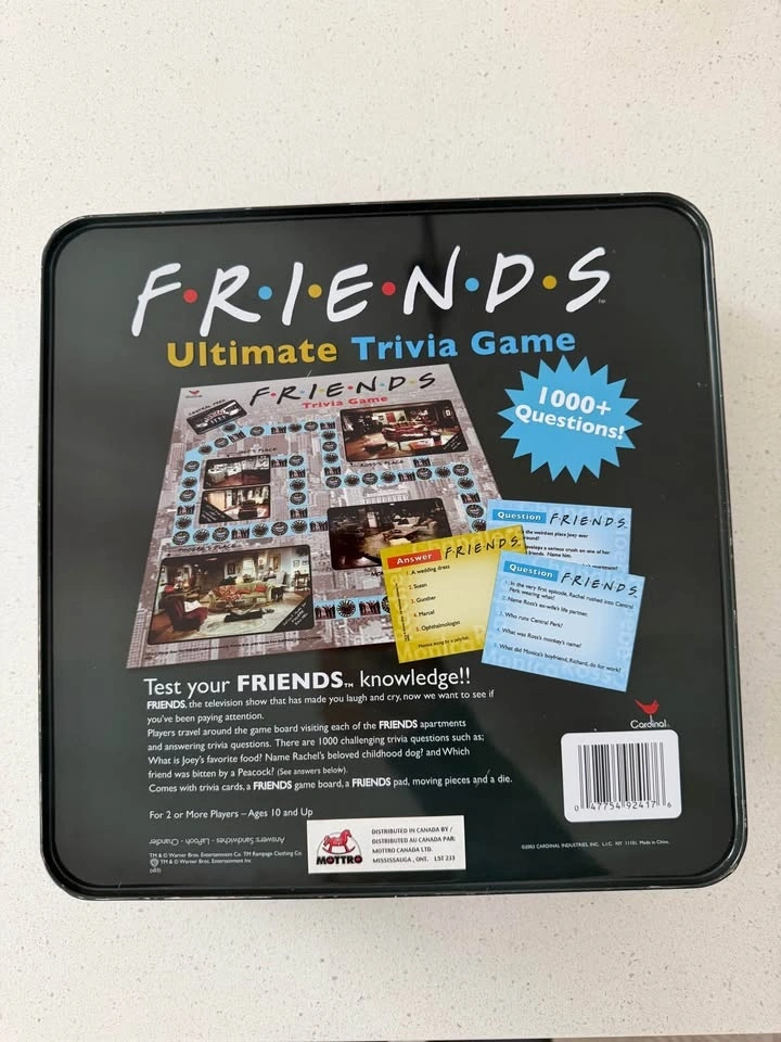 Paid $95. A Fun FRIENDS Ultimate Trivia Game for fans of the show! This Ultimate Edition has 1000+ questions and comes with picture cards! Great for testing your FRIENDS knowledge. Includes the game board, trivia cards, pawns, and a die. For 2 or more players, ages 10 and up.