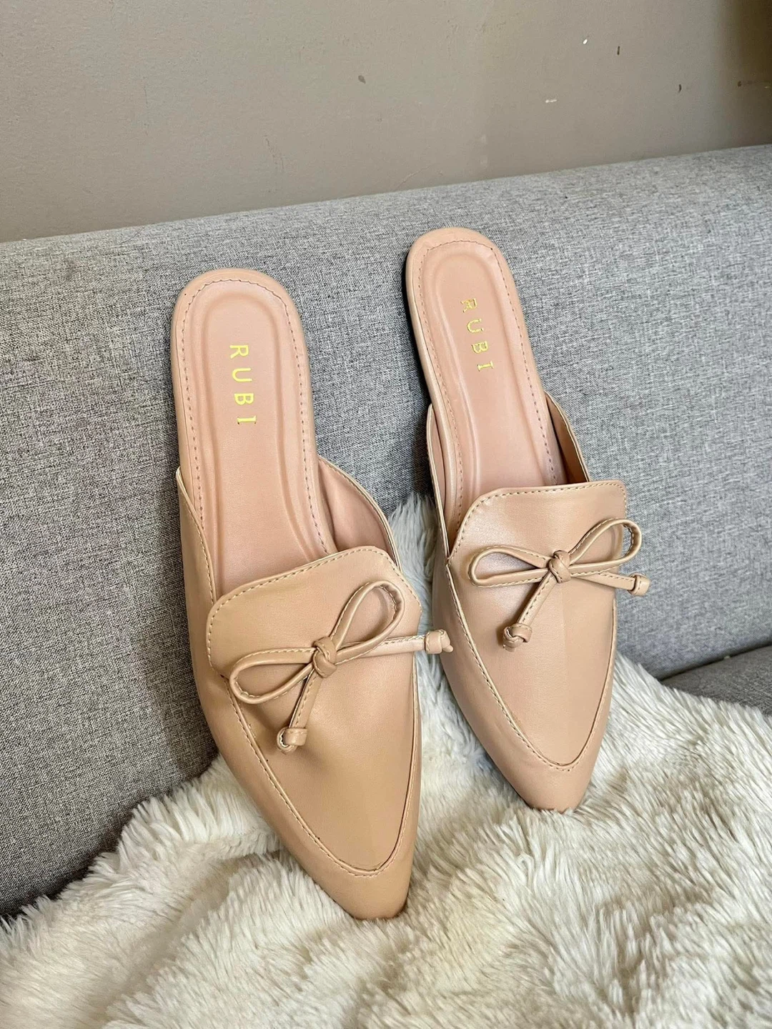 RUBI women's slip-on mules. Features a pointed toe and a decorative bow detail. Beige faux leather material. These flats are great for casual wear or dressing up an outfit!