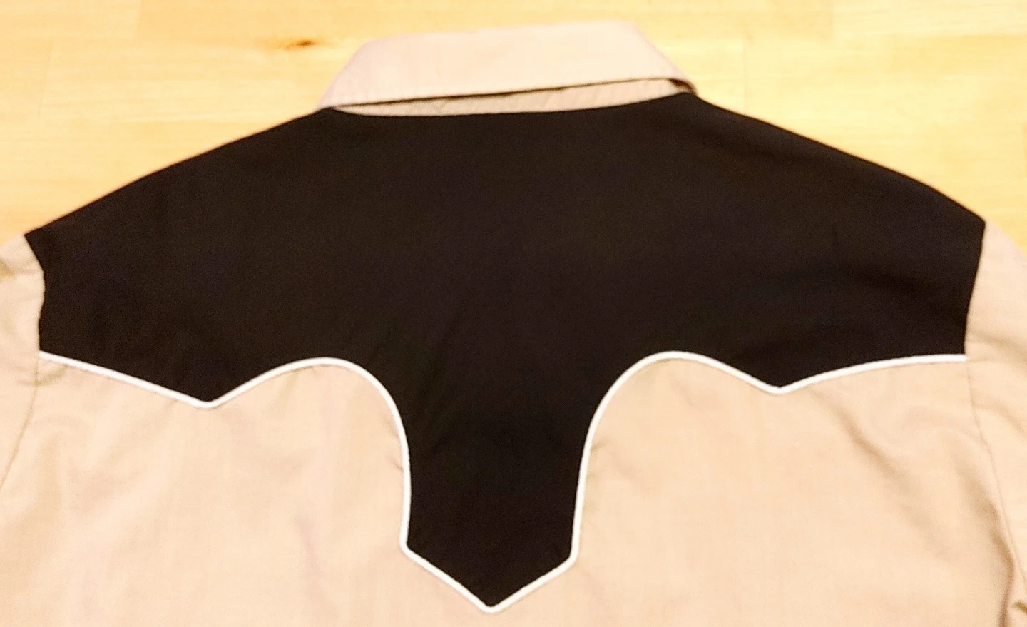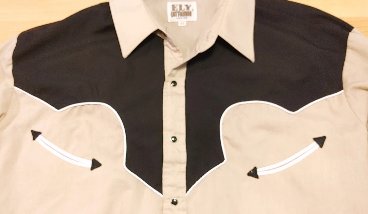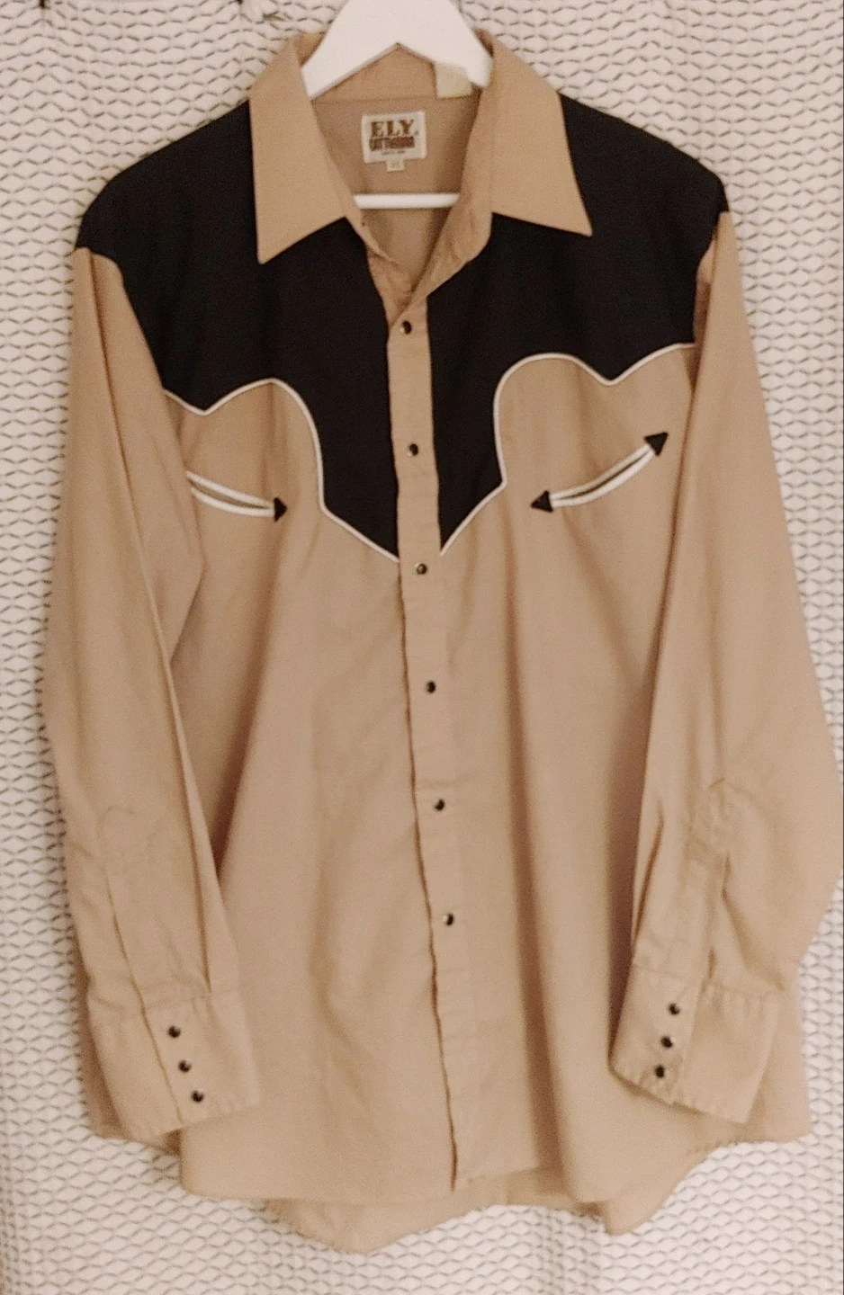 Mens vintage 70's/early 80's size XL tan and black long-sleeve western shirt from ELY Cattleman. Classic western yokes and snap button closures. Shirt is in good condition. Small marks on one sleeve but otherwise in very good shape. All snaps present and working perfectly. 2 front pockets. Smoke free home pick up Mt Brydges cash only.