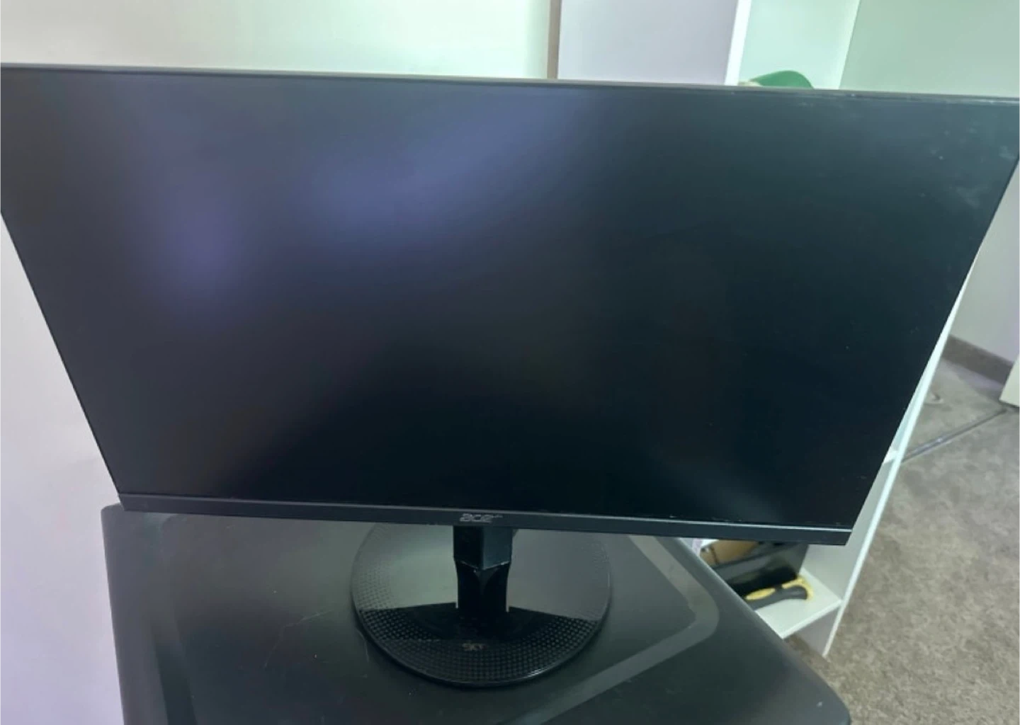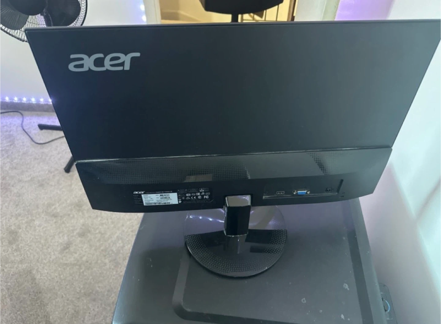 Acer flat screen monitor and its black power adapter are included. The monitor has a sleek black design. It's ready to connect to your computer!
