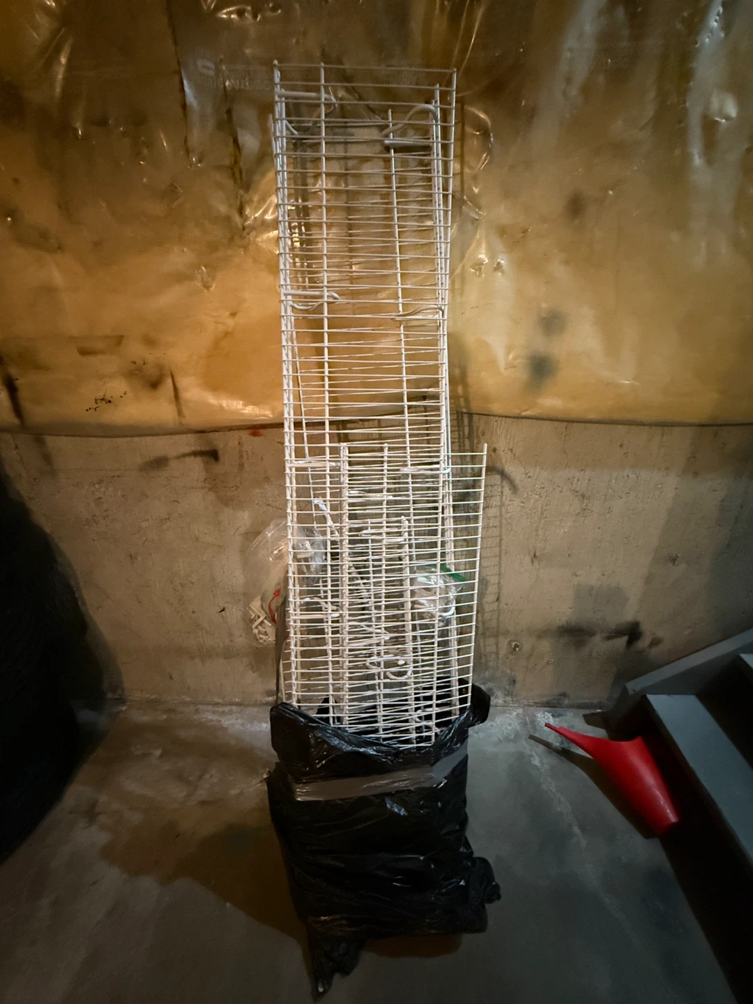 Selling a white wire shelf. It's in good condition and ready for a new home. It's currently disassembled and in a bag for easy transport
