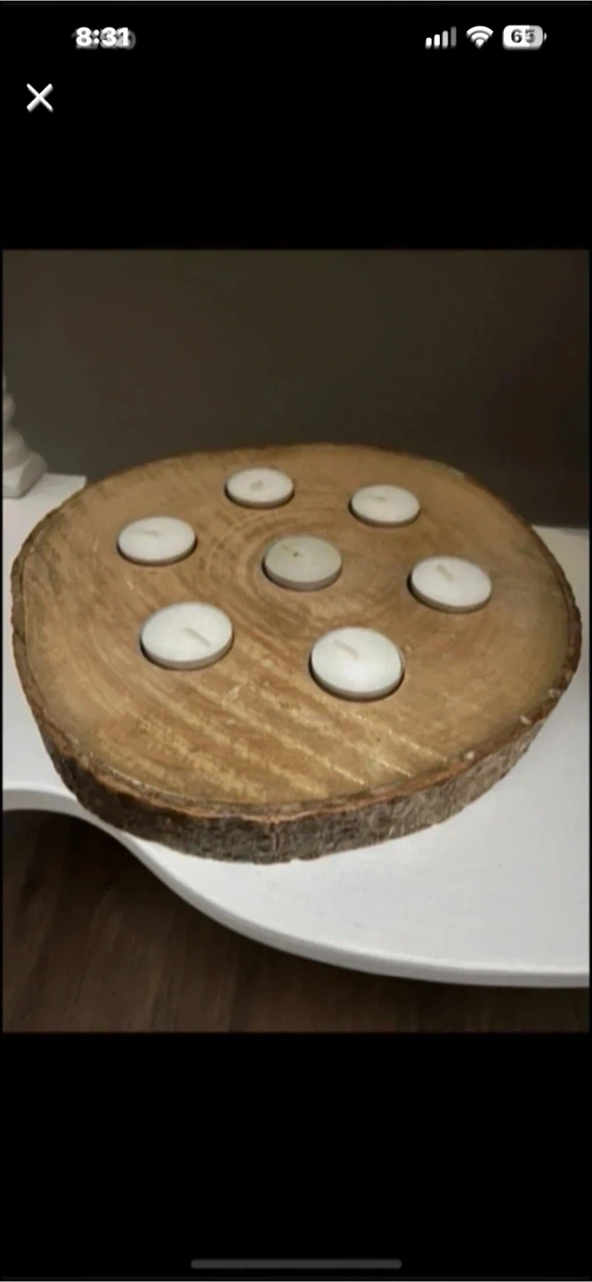 This rustic tea light holder is made from a natural wood slice. It has seven carved out spots for tea lights. It's a lovely piece for adding ambiance to any room.