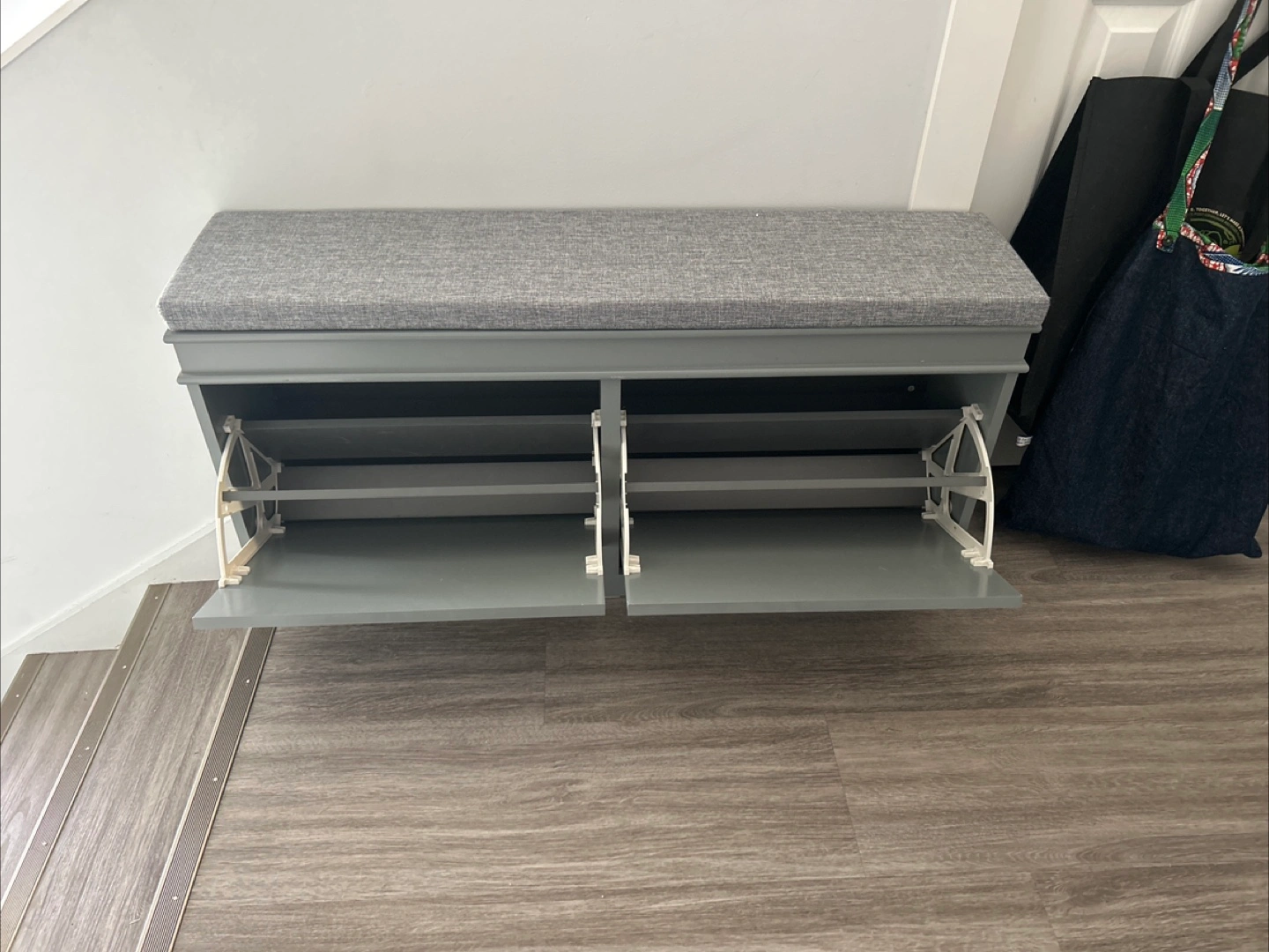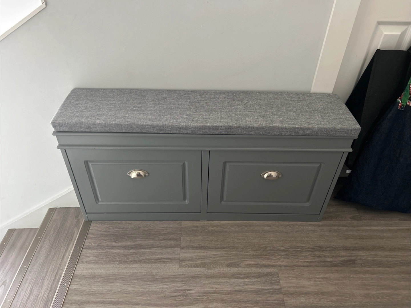 A grey shoe bench. Features a padded cushion and two compartments with pull down doors. It could be the perfect place to sit down and relax while you take off your shoes after a long day.