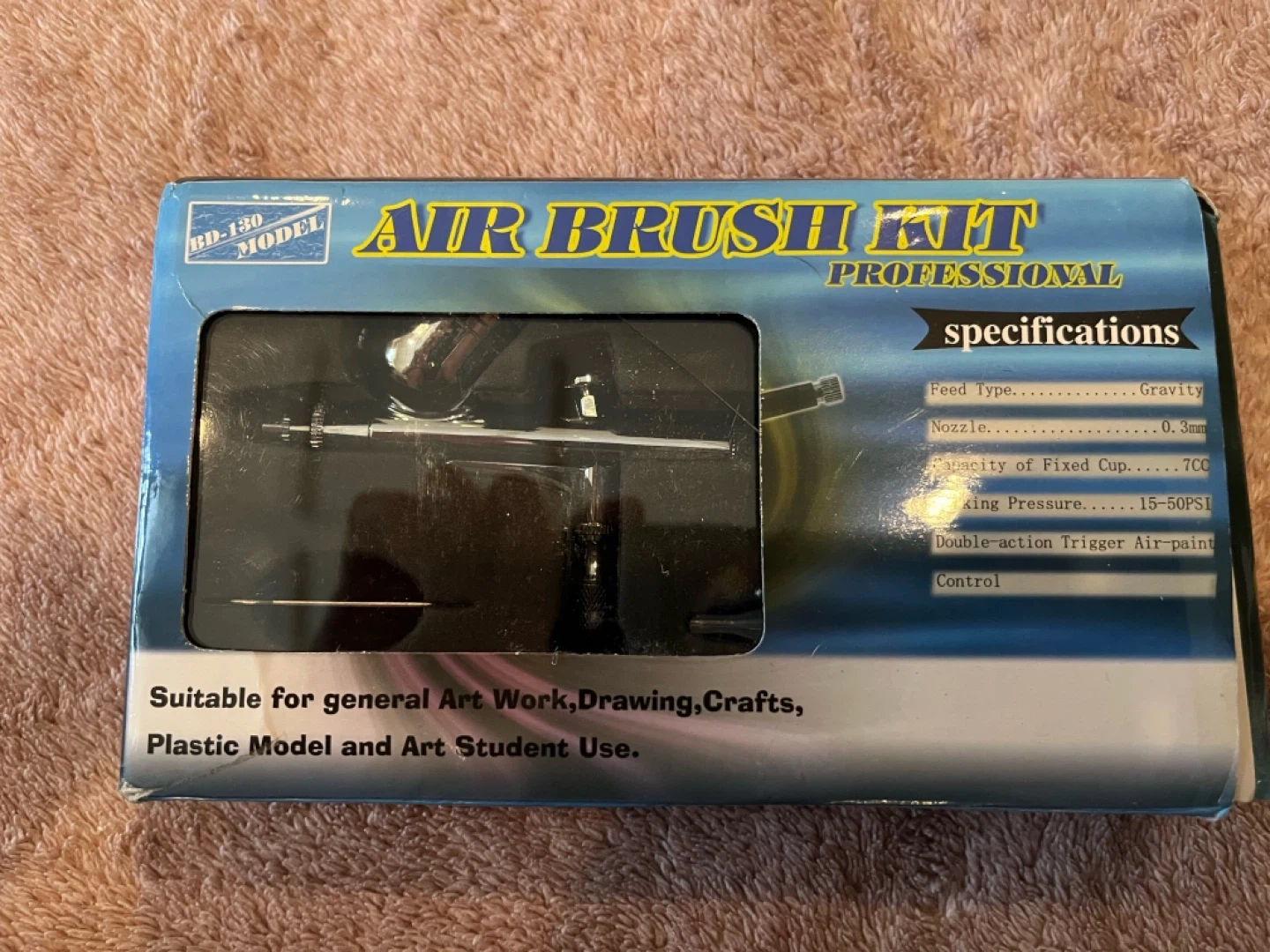 This is a professional air brush kit, model BD-130. It's suitable for general art work, drawing, crafts, plastic models, and art students. The nozzle diameter is 0.3mm, with a fixed cup capacity of 7cc. It operates at a working pressure of 15-50PSI.