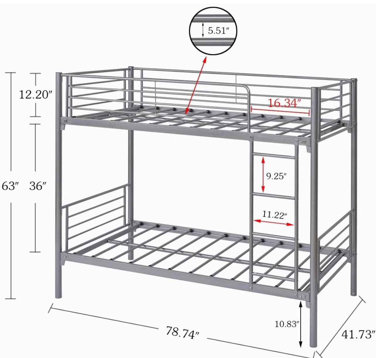 ❄The metal bunk bed frame dimensions:41.73"(W)x78.74"(L)x63"(H),loft bed upper side guardrail is 12.20” high and weighs 93lb