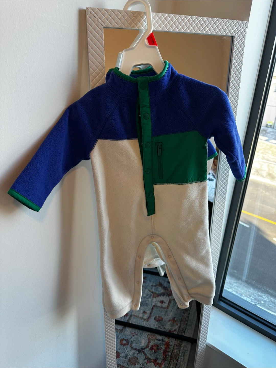 Cozy fleece bunting suit from Old Navy in a colour-block design. It's a size 6-12 months. This soft sleepsuit has a zip pocket on the chest and snap closures along the bottom for easy changes. Perfect for keeping little ones warm!