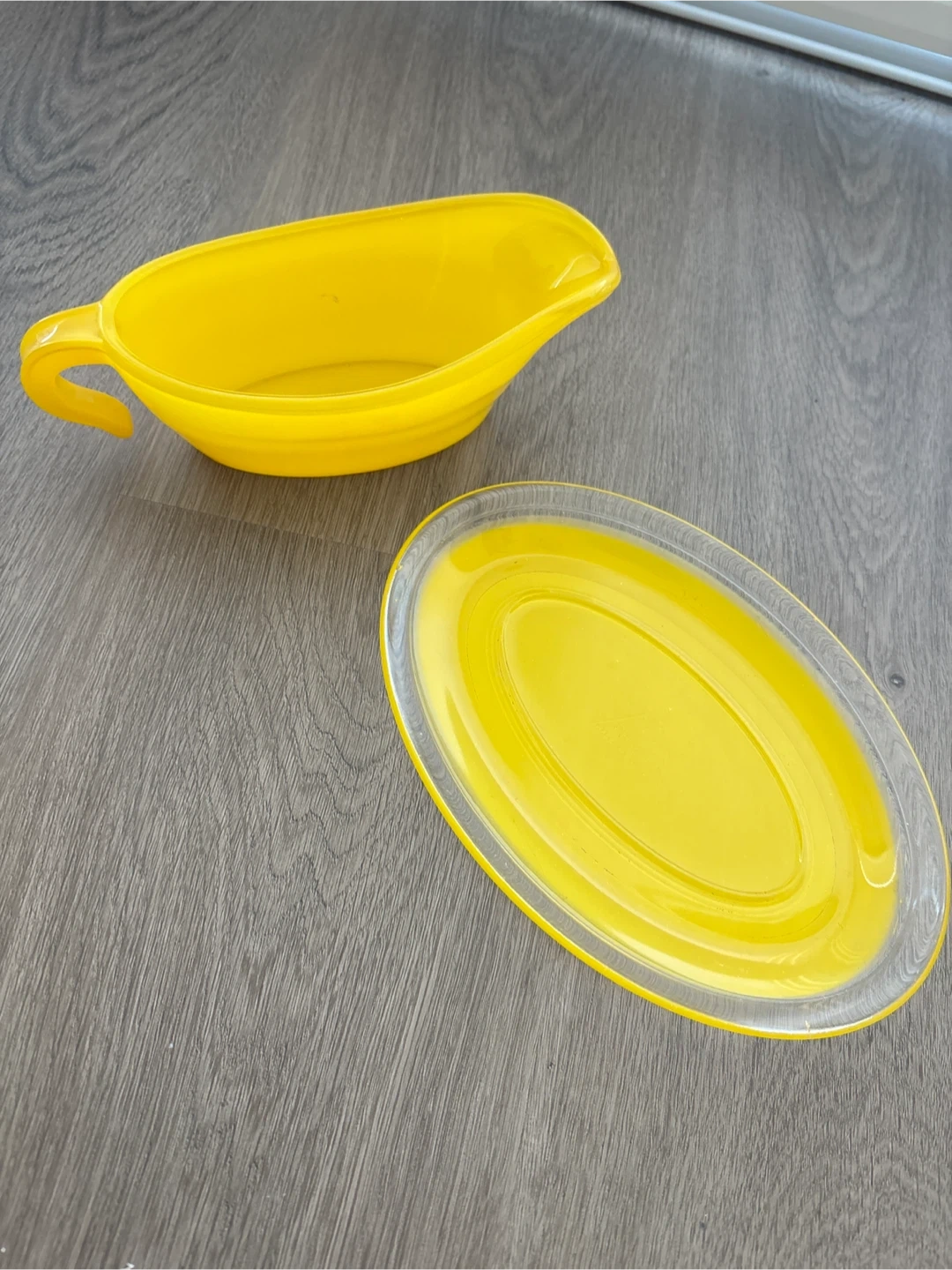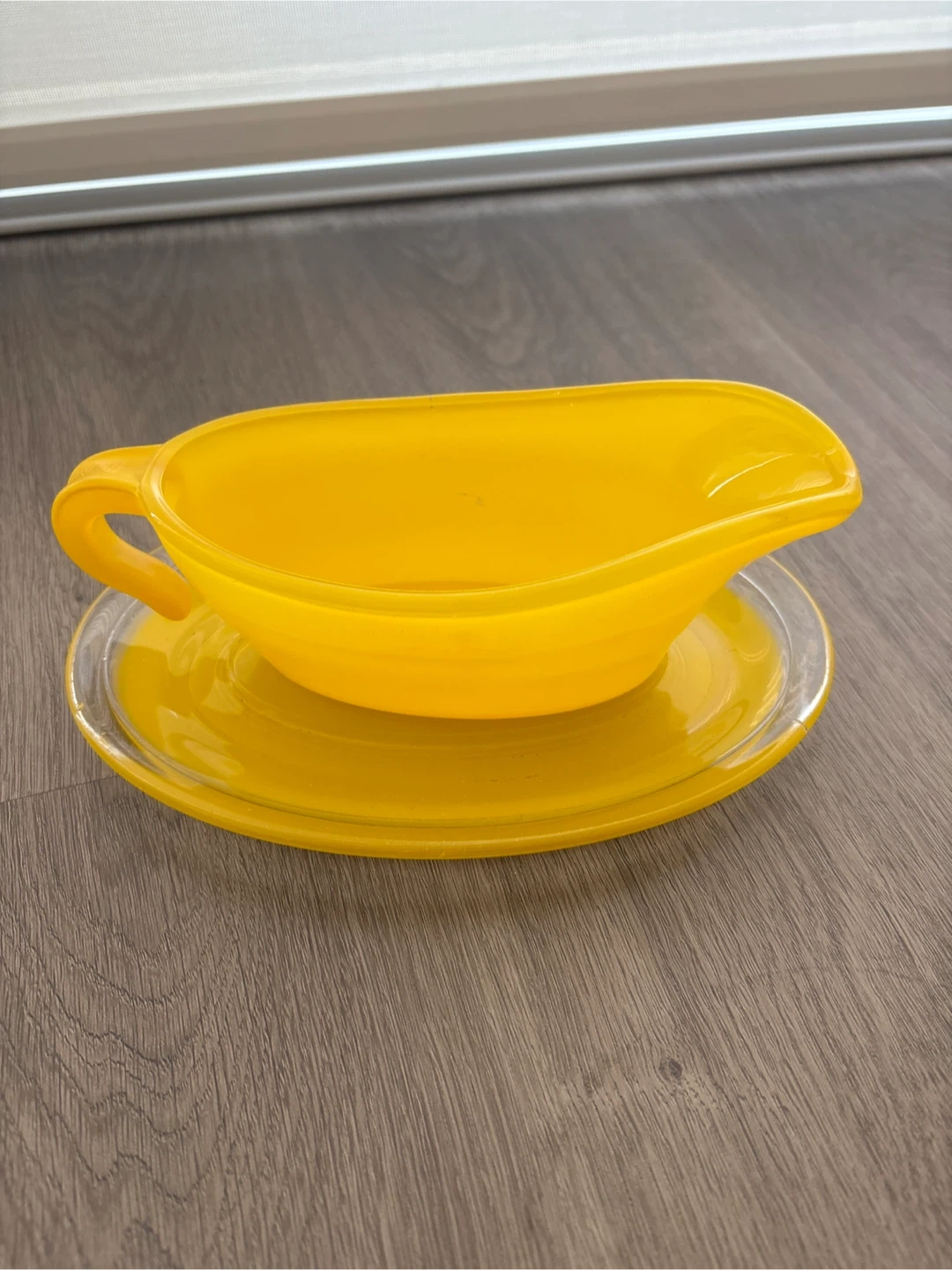 A vintage and glass bright yellow gravy boat and matching saucer set. This is a fun, vibrant piece for serving sauces or gravies.