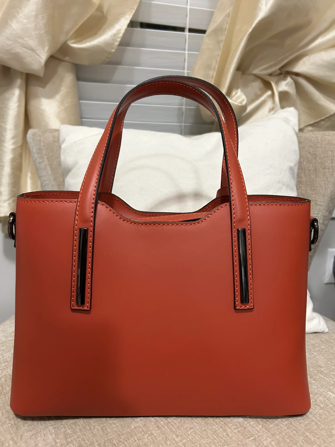 Selling a lovely orange leather tote bag! It's in great condition and comes with a detachable shoulder strap. Perfect for everyday use or a special occasion. The colour is a vibrant orange, and the leather feels really nice to the touch
