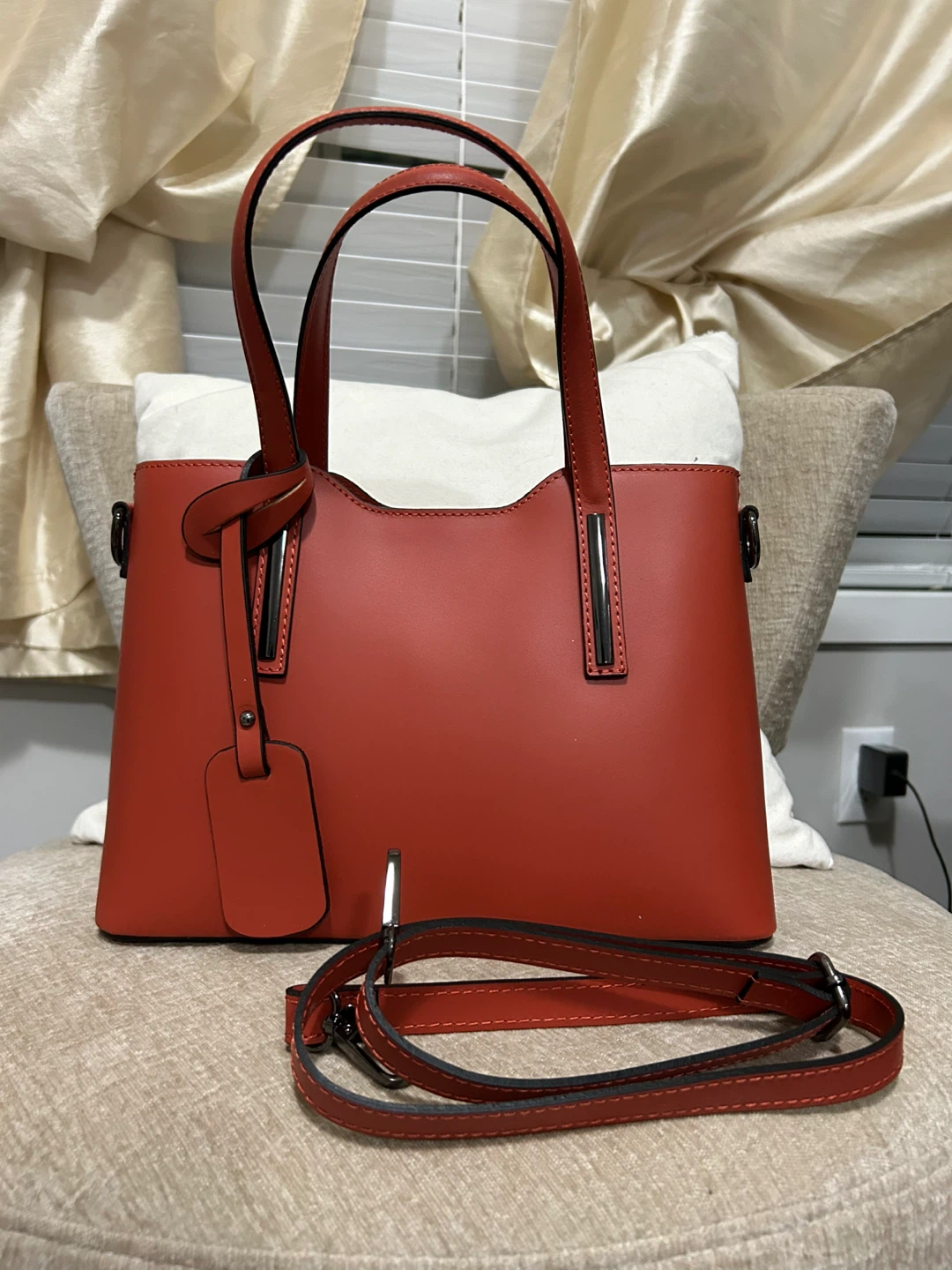 Selling a lovely orange leather tote bag! It's in great condition and comes with a detachable shoulder strap. Perfect for everyday use or a special occasion. The colour is a vibrant orange, and the leather feels really nice to the touch