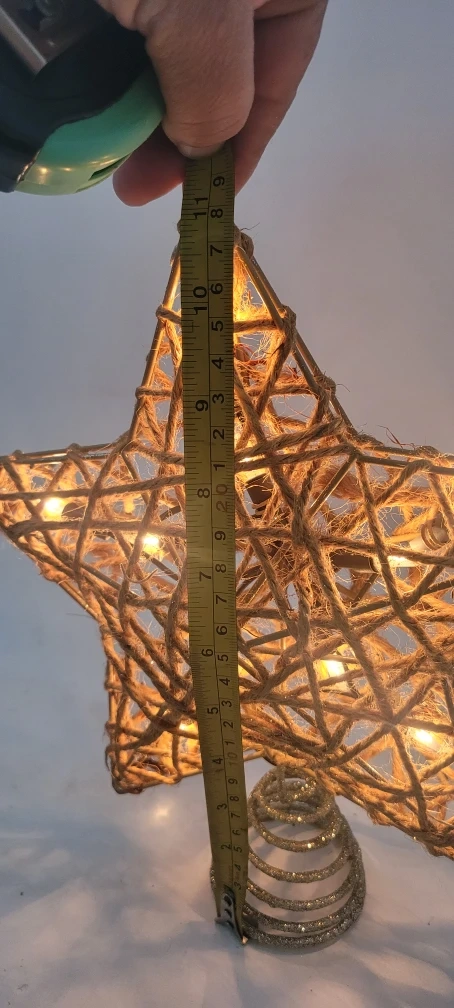Add a touch of sparkle to your Christmas tree with this star-shaped topper! It measures approximately 11 inches in height and features a woven design with lights. Perfect for completing your holiday decor