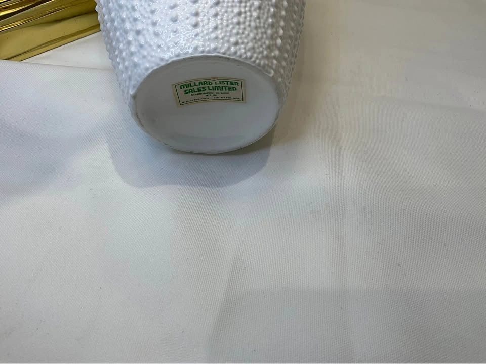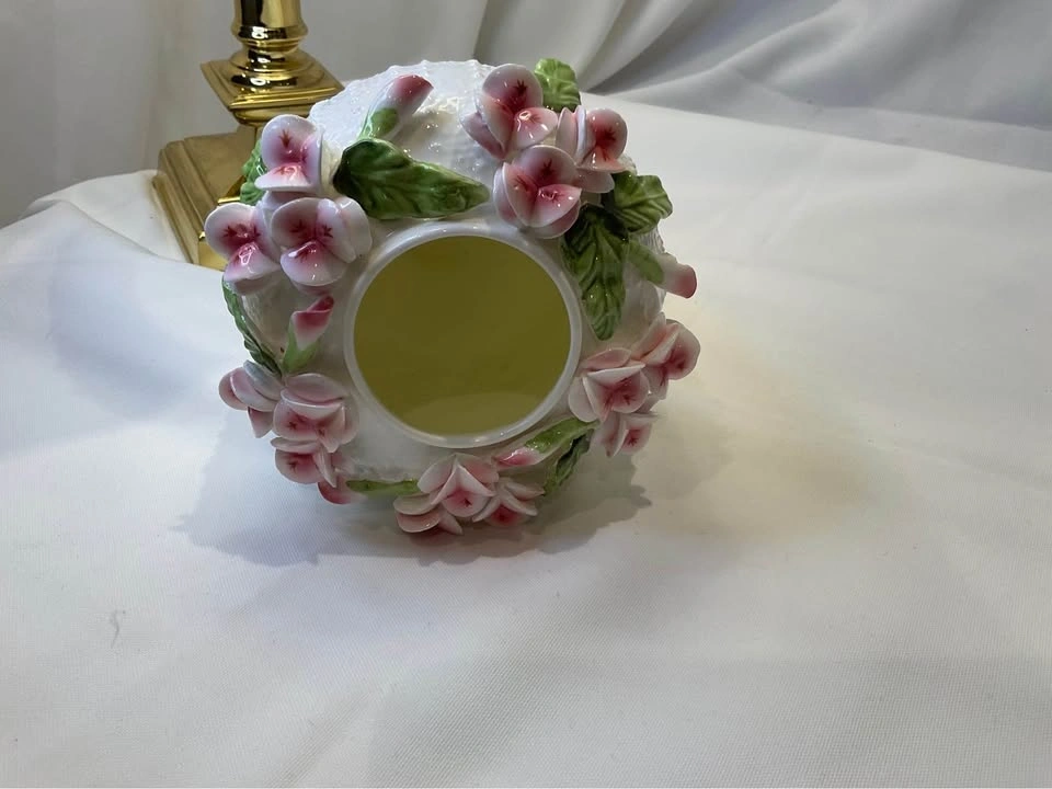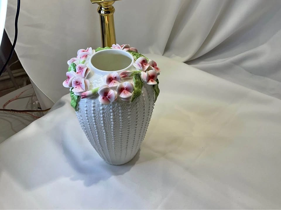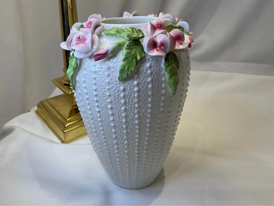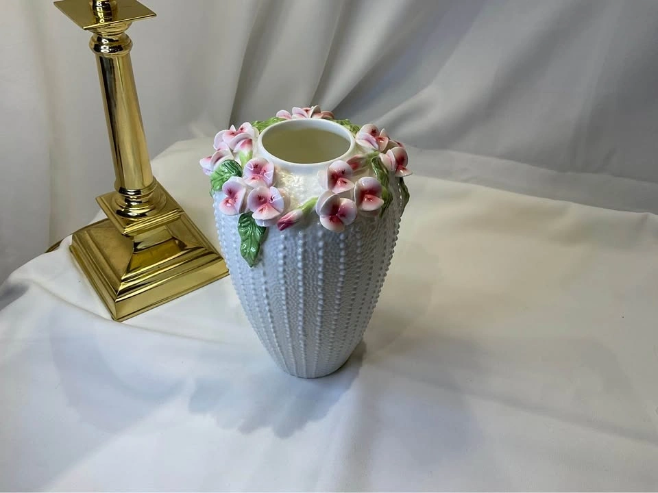 Beautiful floral vase with delicate raised flowers and a ribbed design. Good condition. Height 8". From a smoke and pet-free home. Cash only in Richmond Hill at Bathurst & King Rd.