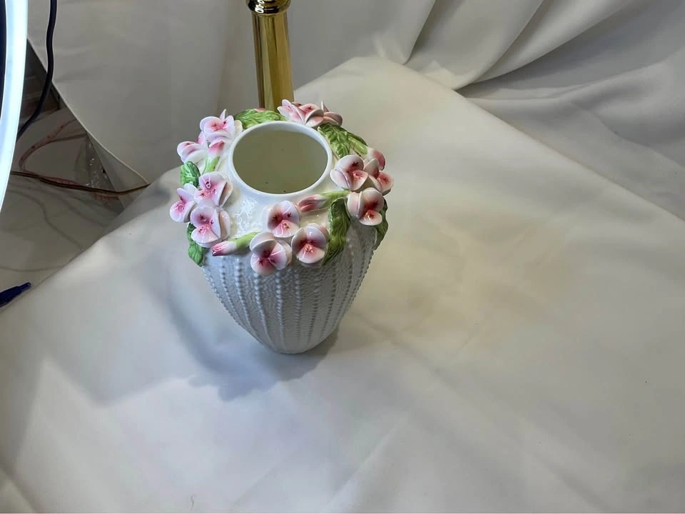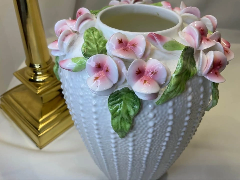 Beautiful floral vase with delicate raised flowers and a ribbed design. Good condition. Height 8". From a smoke and pet-free home. Cash only in Richmond Hill at Bathurst & King Rd.