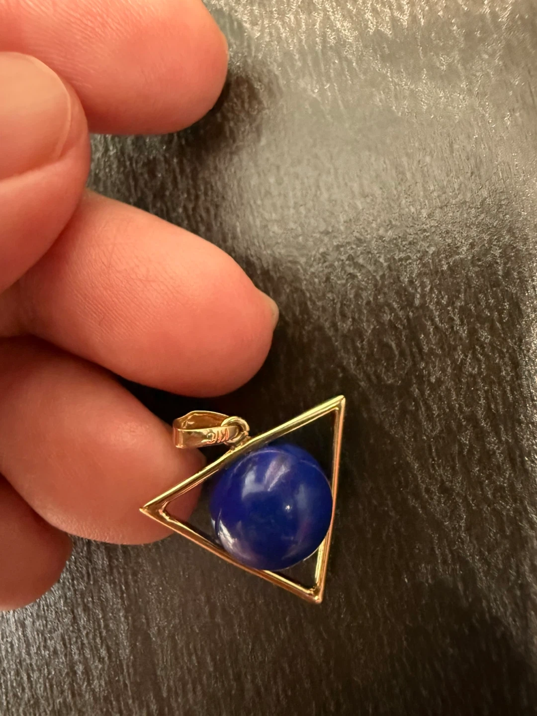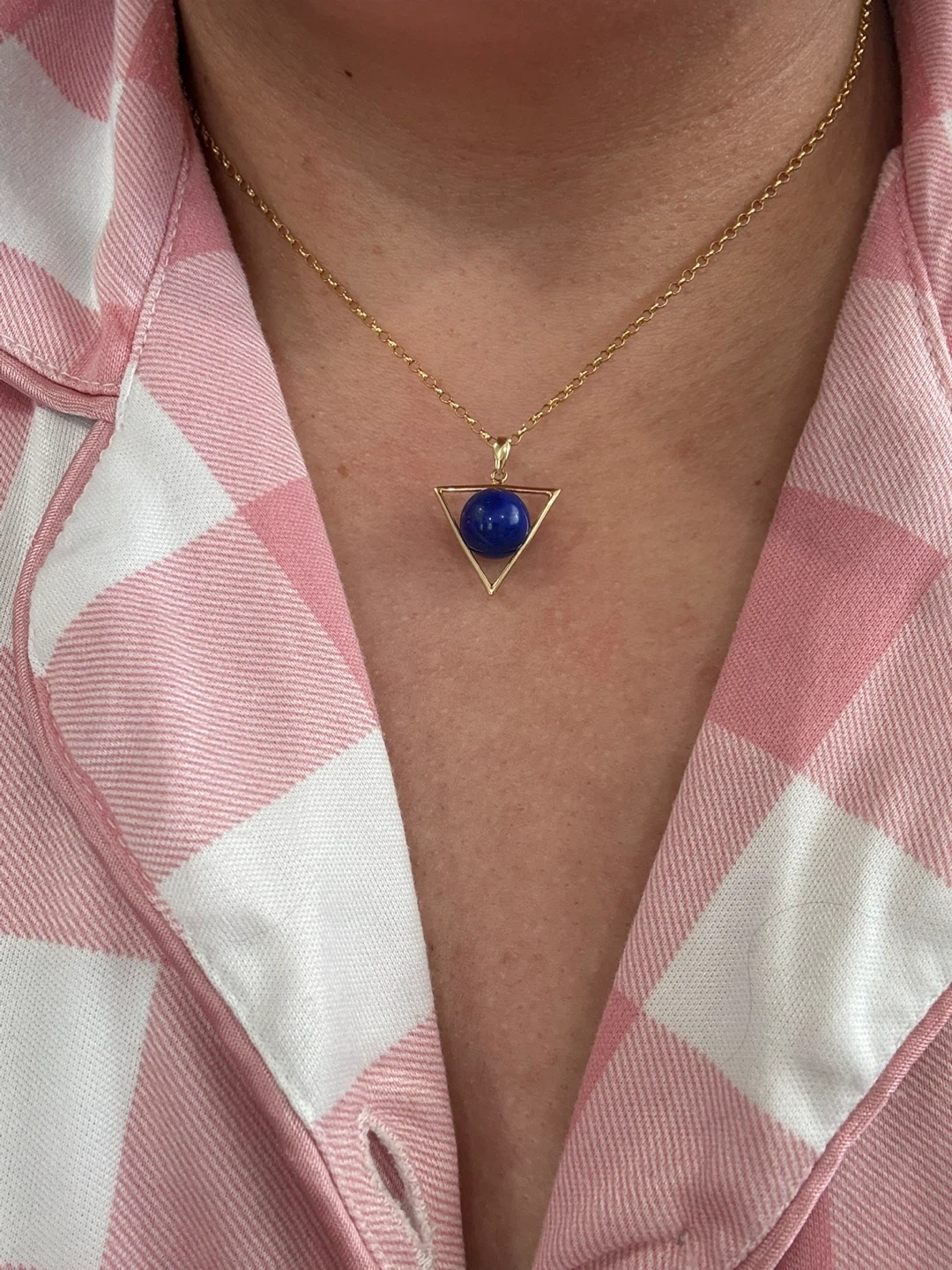 Striking and modern Lapiz Lazuli pendant set in 18K yellow gold, featuring a deep royal blue natural stone framed in a sleek triangular design. The geometric setting gives it a subtle evil eye vibe—minimalist yet bold.