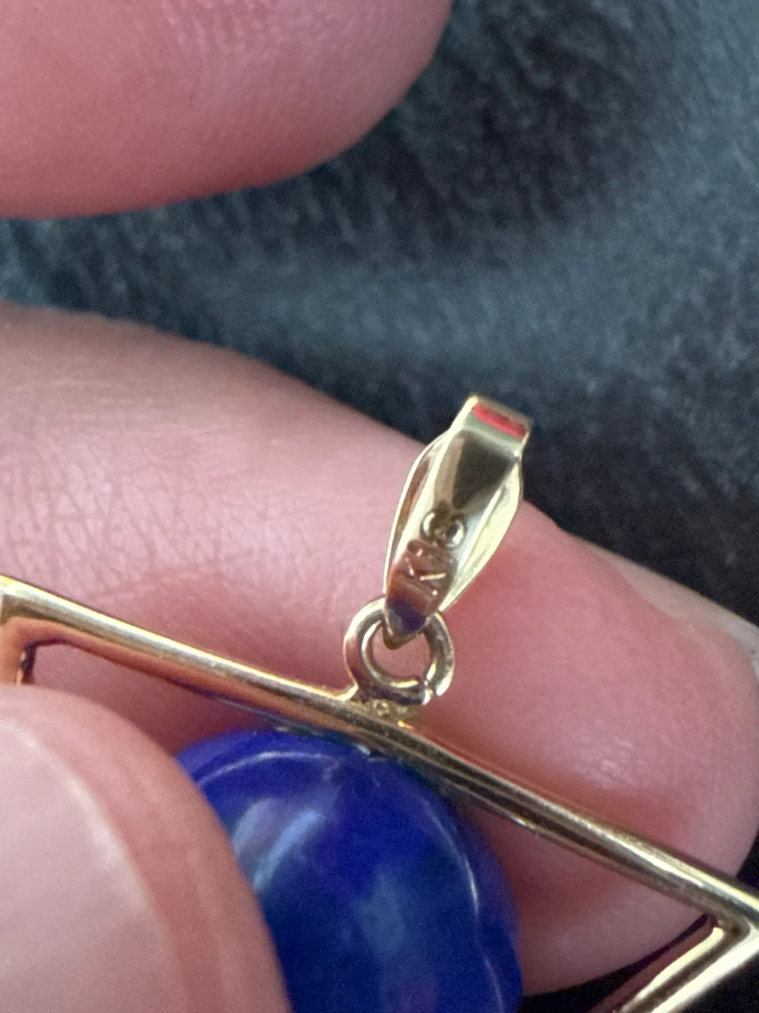 Striking and modern Lapiz Lazuli pendant set in 18K yellow gold, featuring a deep royal blue natural stone framed in a sleek triangular design. The geometric setting gives it a subtle evil eye vibe—minimalist yet bold.