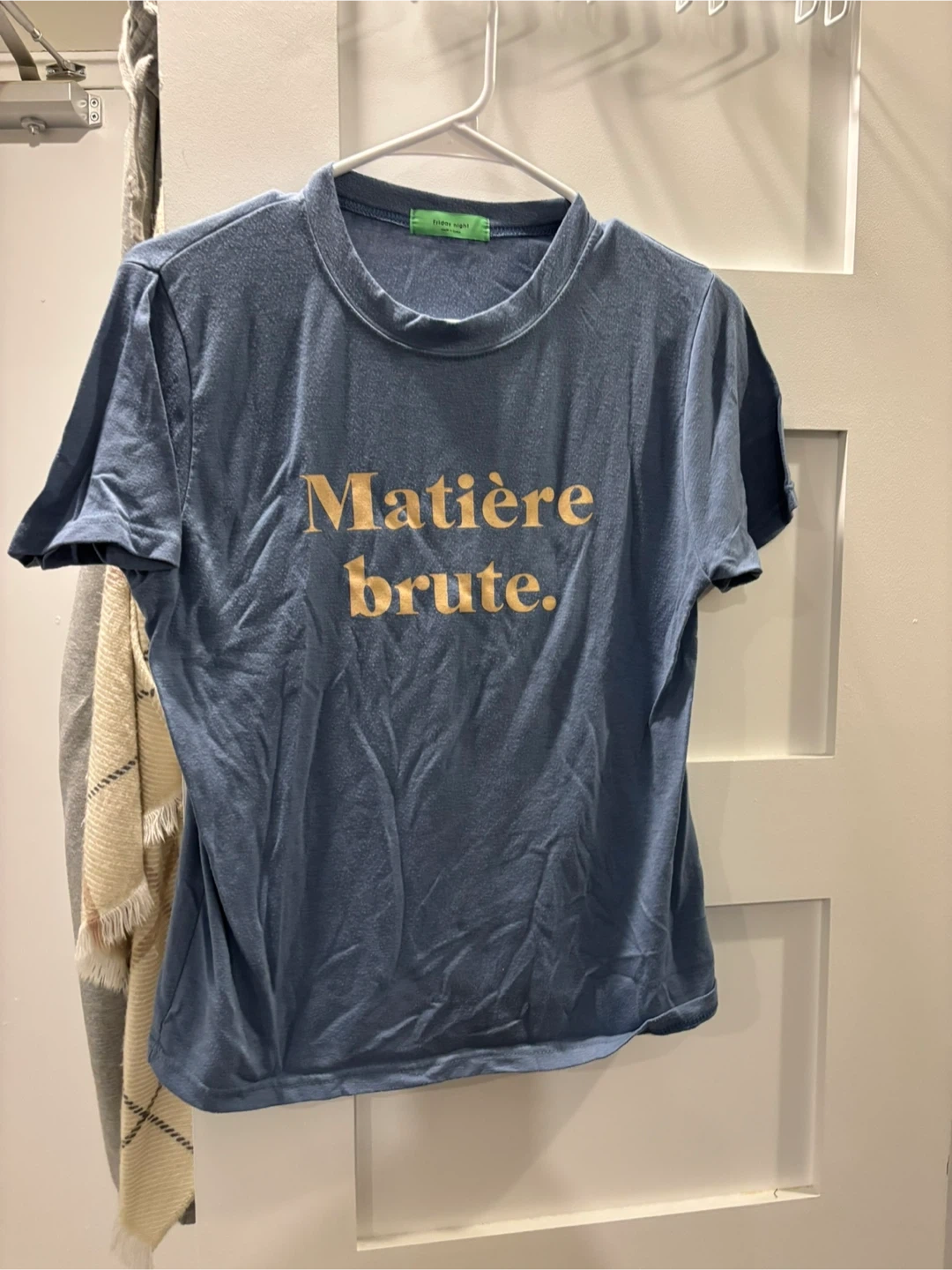 Blue short-sleeve t-shirt from Friday Night with "Matière brute." graphic. It's a comfy tee for casual wear.