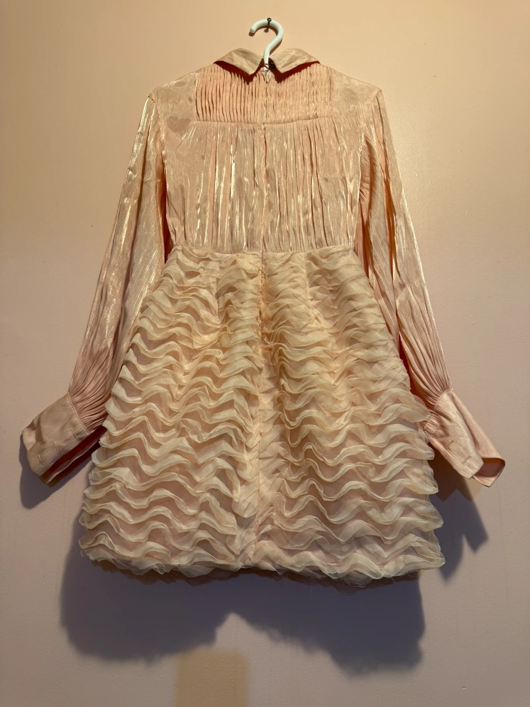 This is a beautiful pink mini dress with long sleeves and a ruffle skirt. It's perfect for a night out or a special occasion. The dress is in great condition and has been well cared for. It's a unique piece that will definitely turn heads