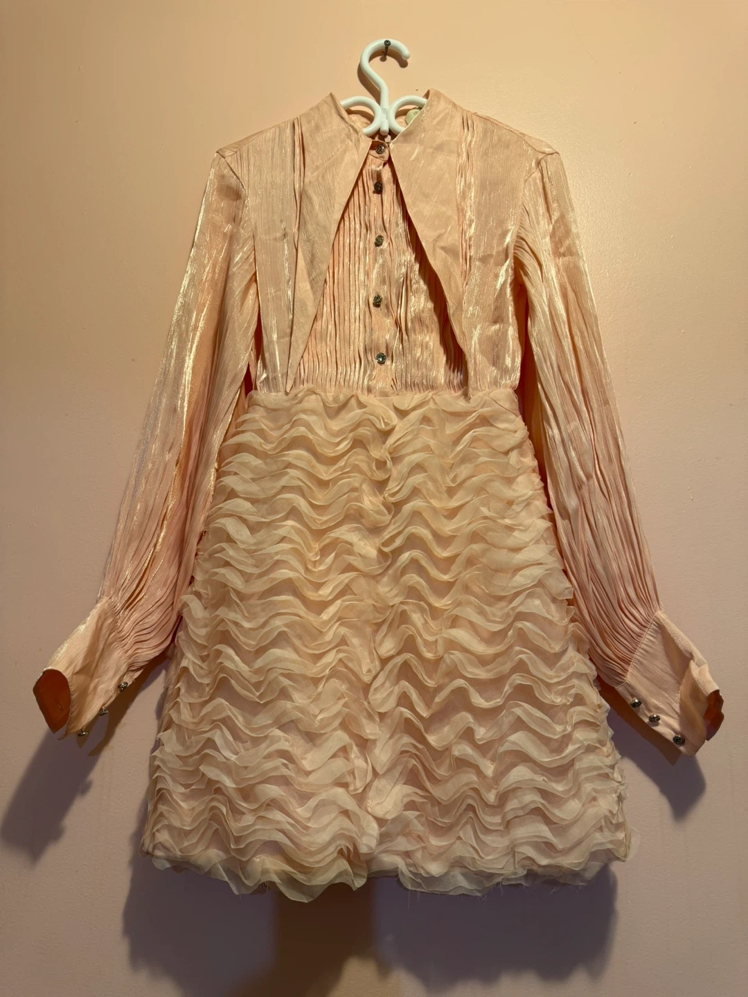 This is a beautiful pink mini dress with long sleeves and a ruffle skirt. It's perfect for a night out or a special occasion. The dress is in great condition and has been well cared for. It's a unique piece that will definitely turn heads
