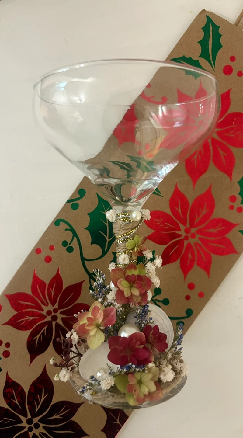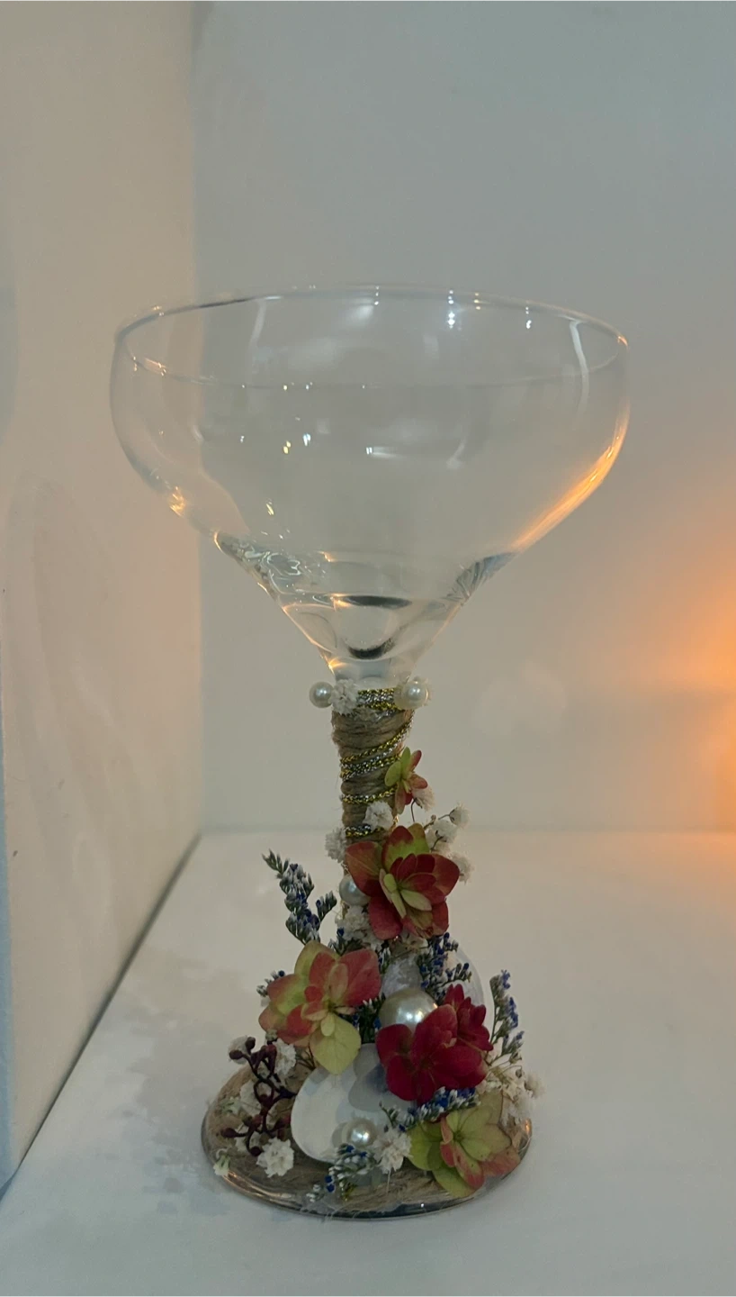 Selling a beautiful champagne coupe glass with unique floral and pearl decorations. Perfect for adding a touch of elegance to your home decor or special occasions!