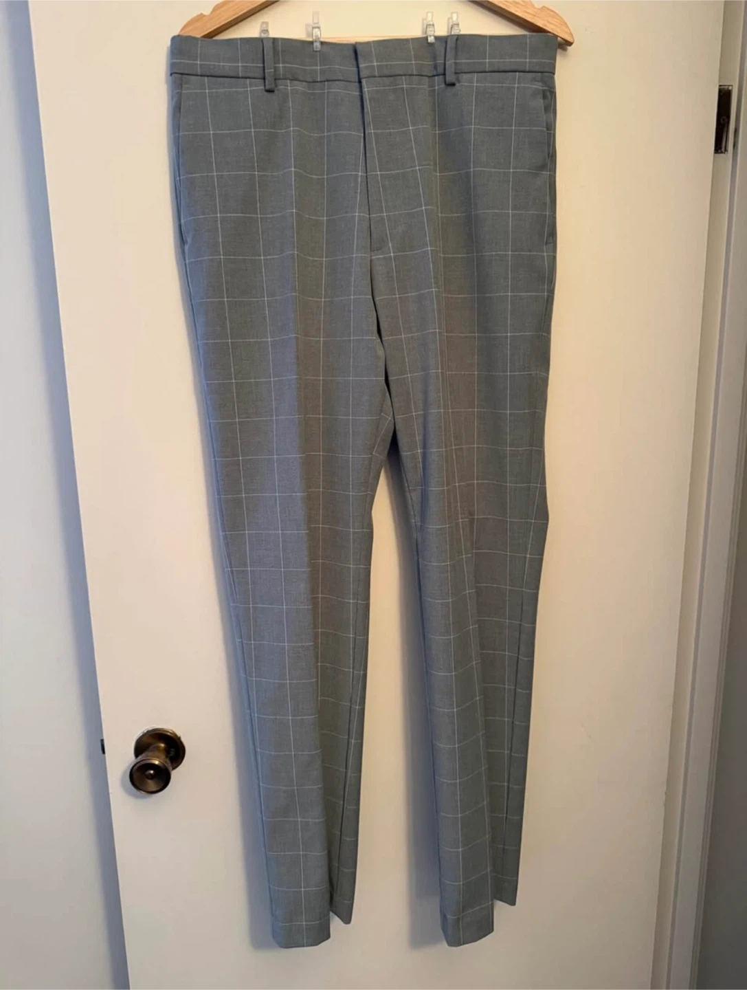 These are grey H&M slim fit dress pants with a white plaid pattern. They're a men's size US 32 waist. Made in Bangladesh.