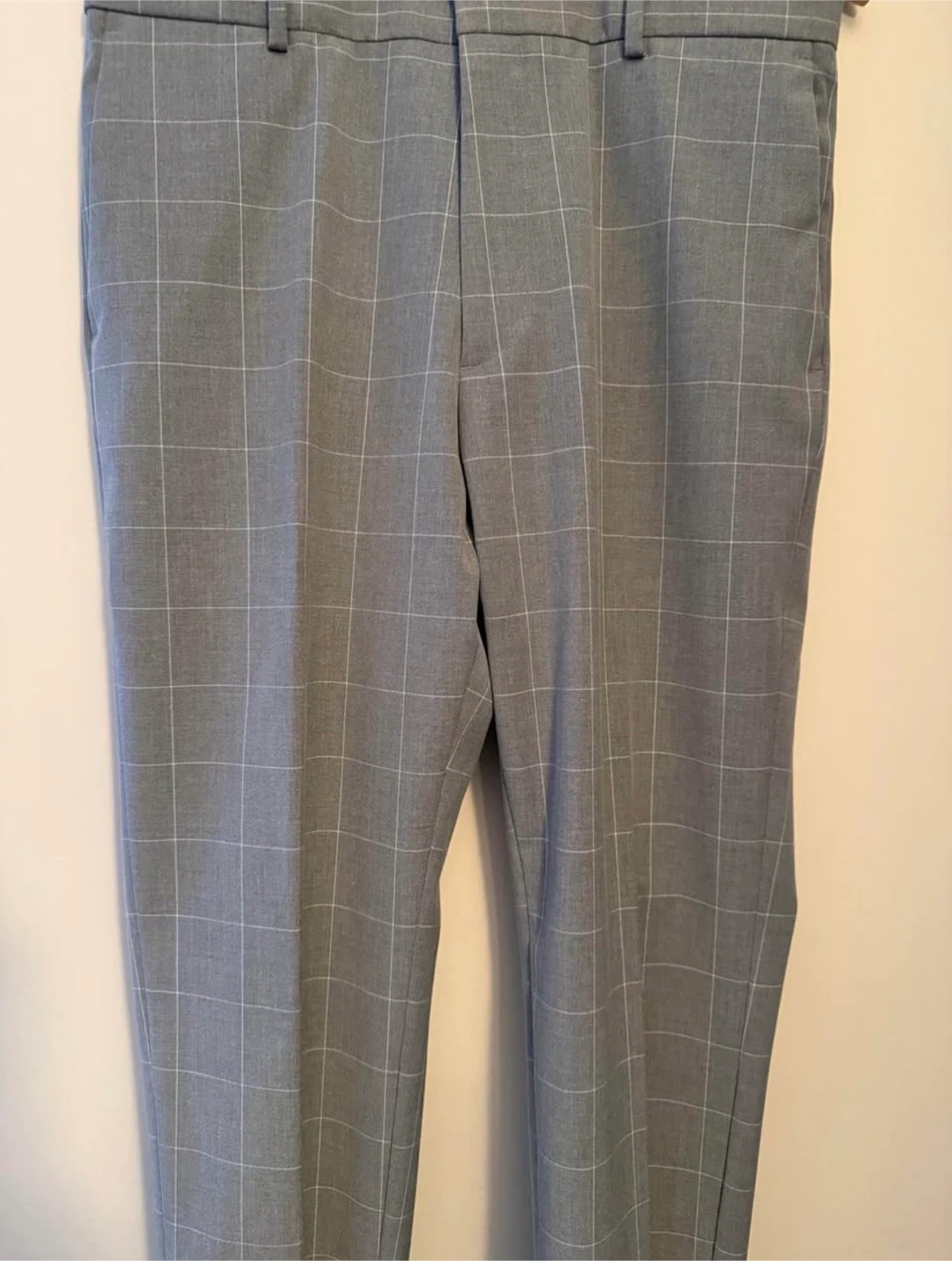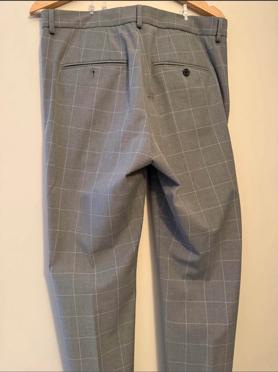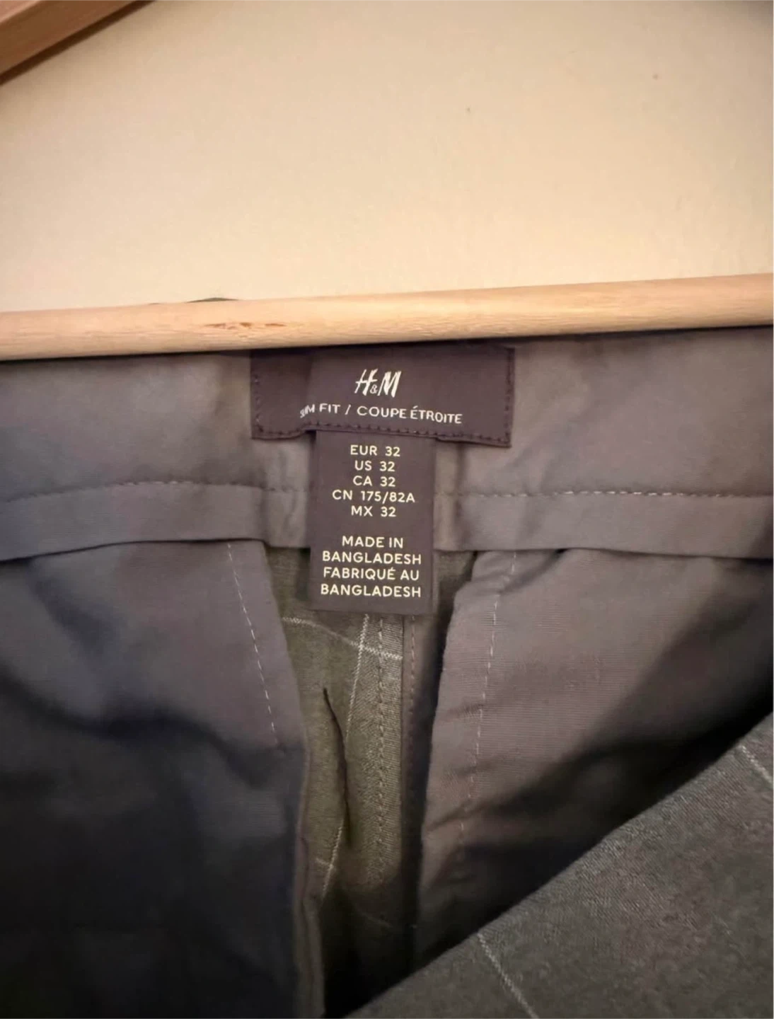 These are grey H&M slim fit dress pants with a white plaid pattern. They're a men's size US 32 waist. Made in Bangladesh.
