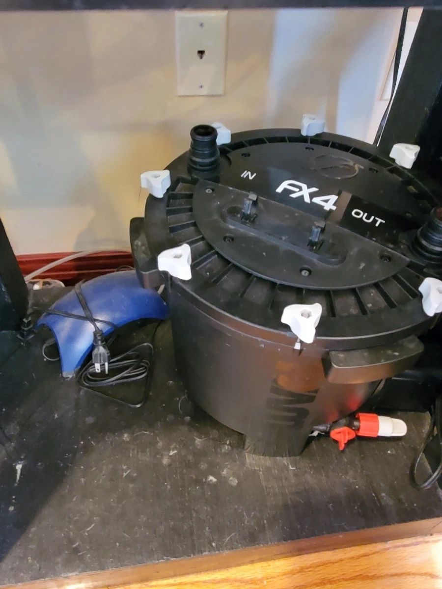 Fluval FX4 canister filter for aquariums. Features a multi-stage filtration system. Includes hoses and fittings for setup. This filter is designed for efficient water clarification.