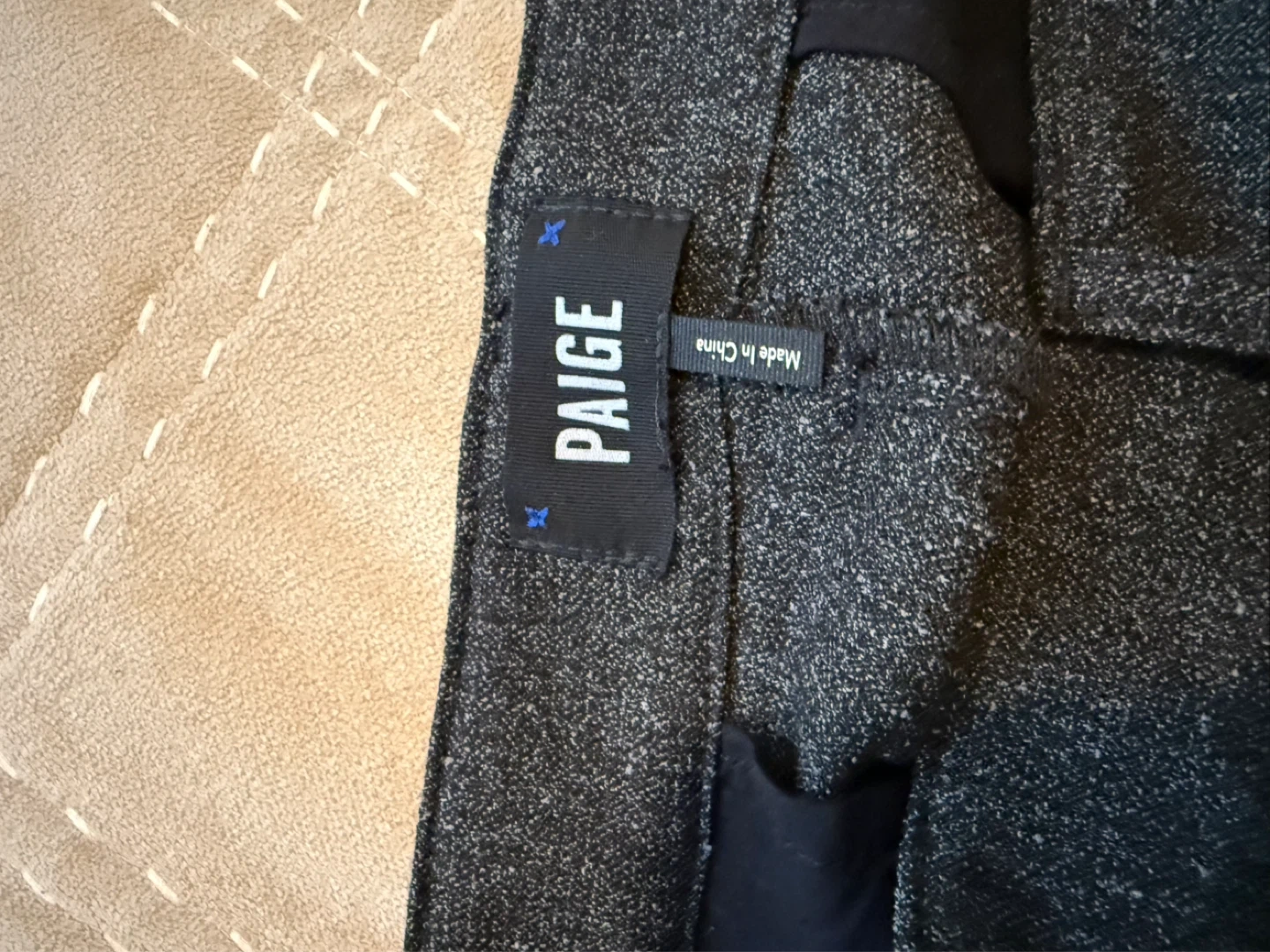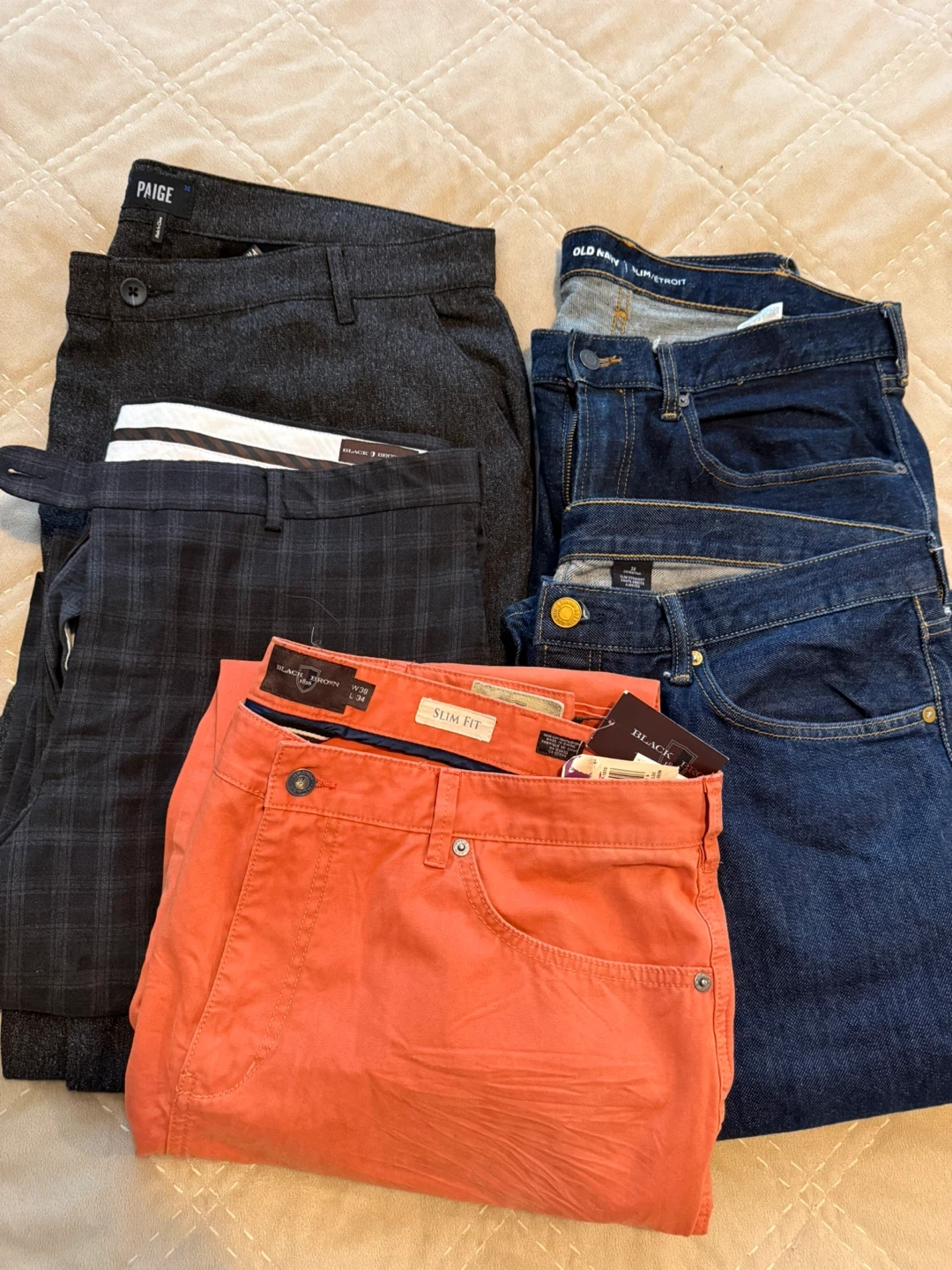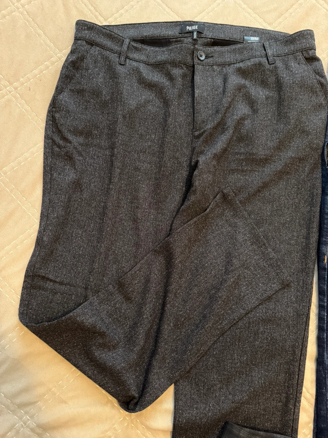 Bundle of five pairs of pants including Paige grey dress pants, Paige plaid pants, Old Navy dark wash jeans, and two pairs of slim fit coloured pants. Assorted sizes and materials.