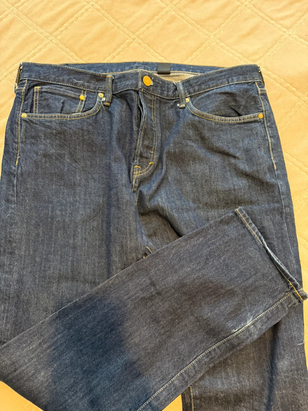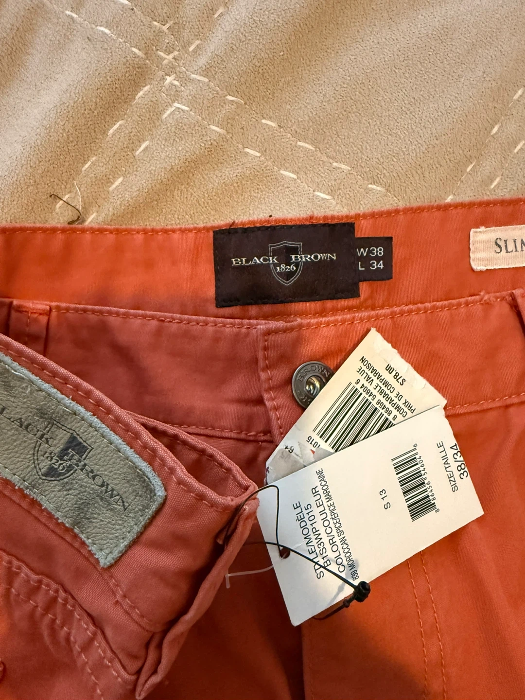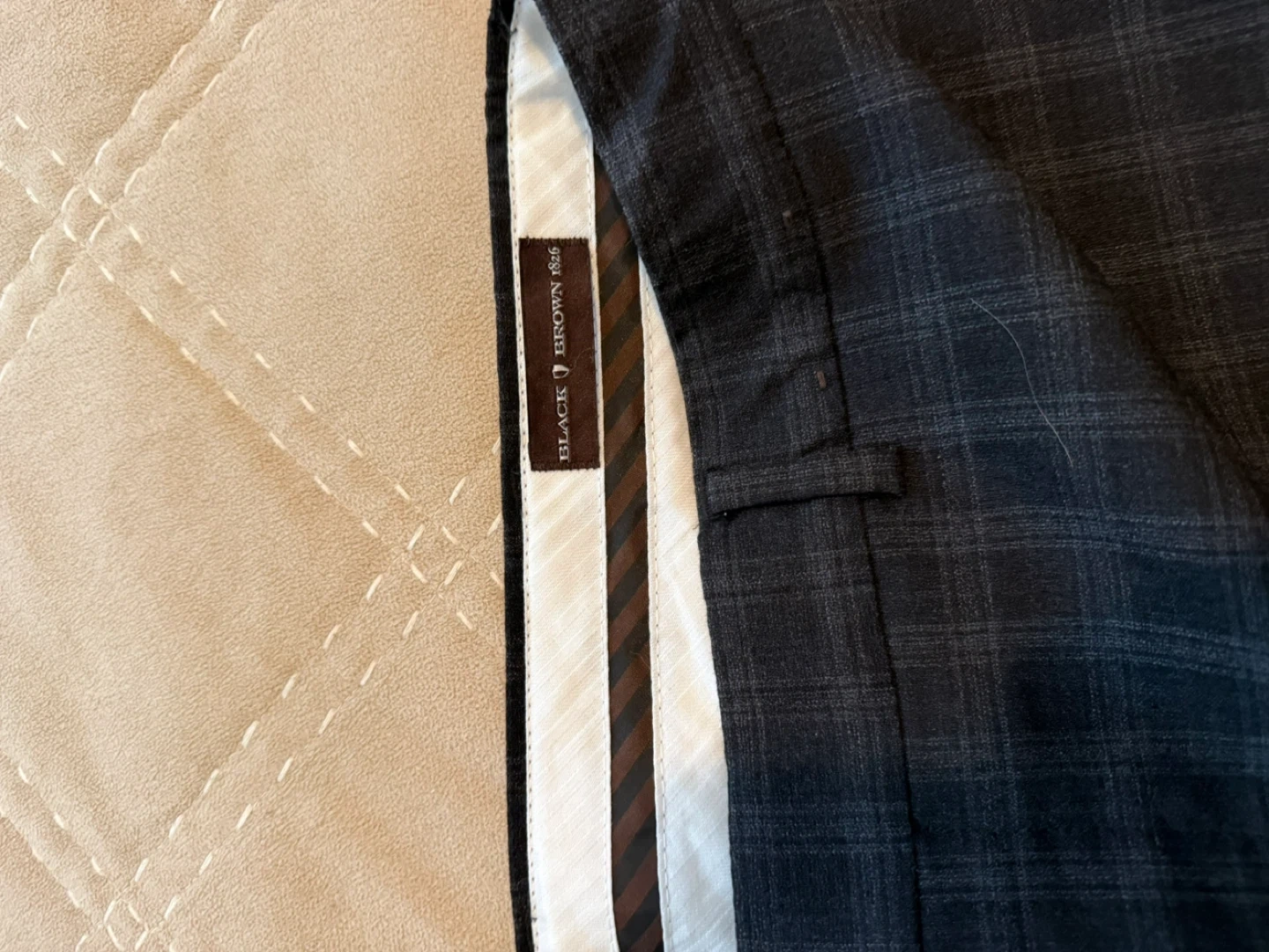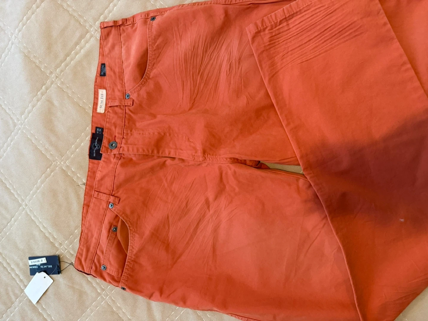 Bundle of five pairs of pants including Paige grey dress pants, Paige plaid pants, Old Navy dark wash jeans, and two pairs of slim fit coloured pants. Assorted sizes and materials.