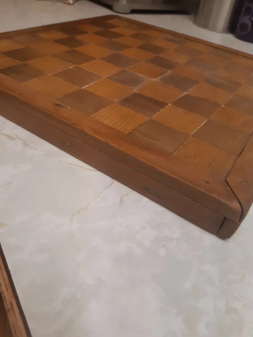Selling a wooden chess board. It's in good condition and ready for a new home! The board has a classic checkered pattern and the wood has a warm, natural tone