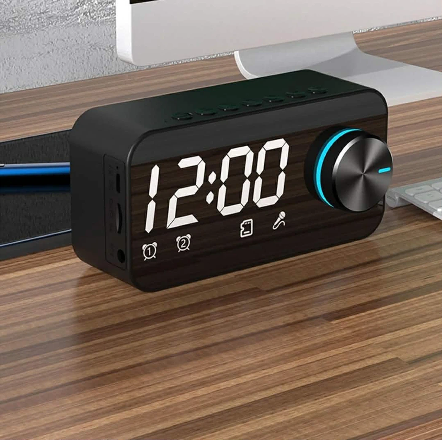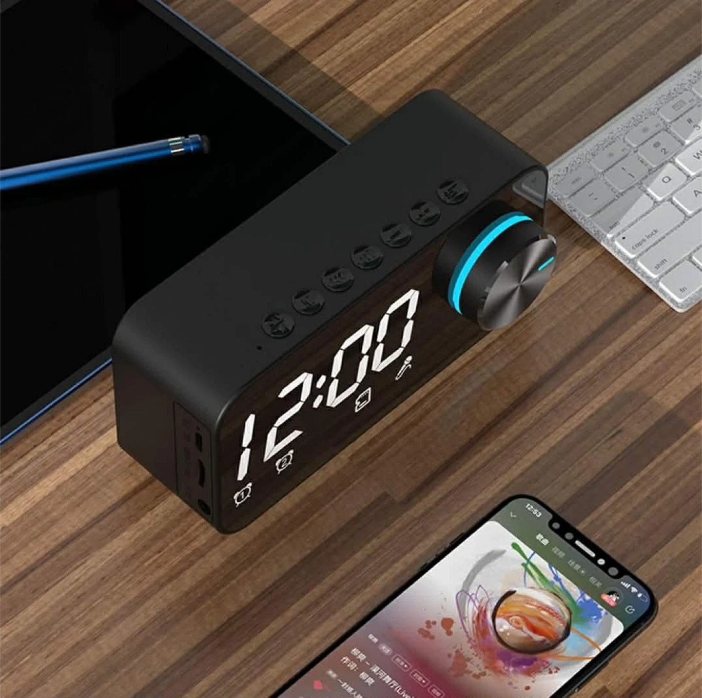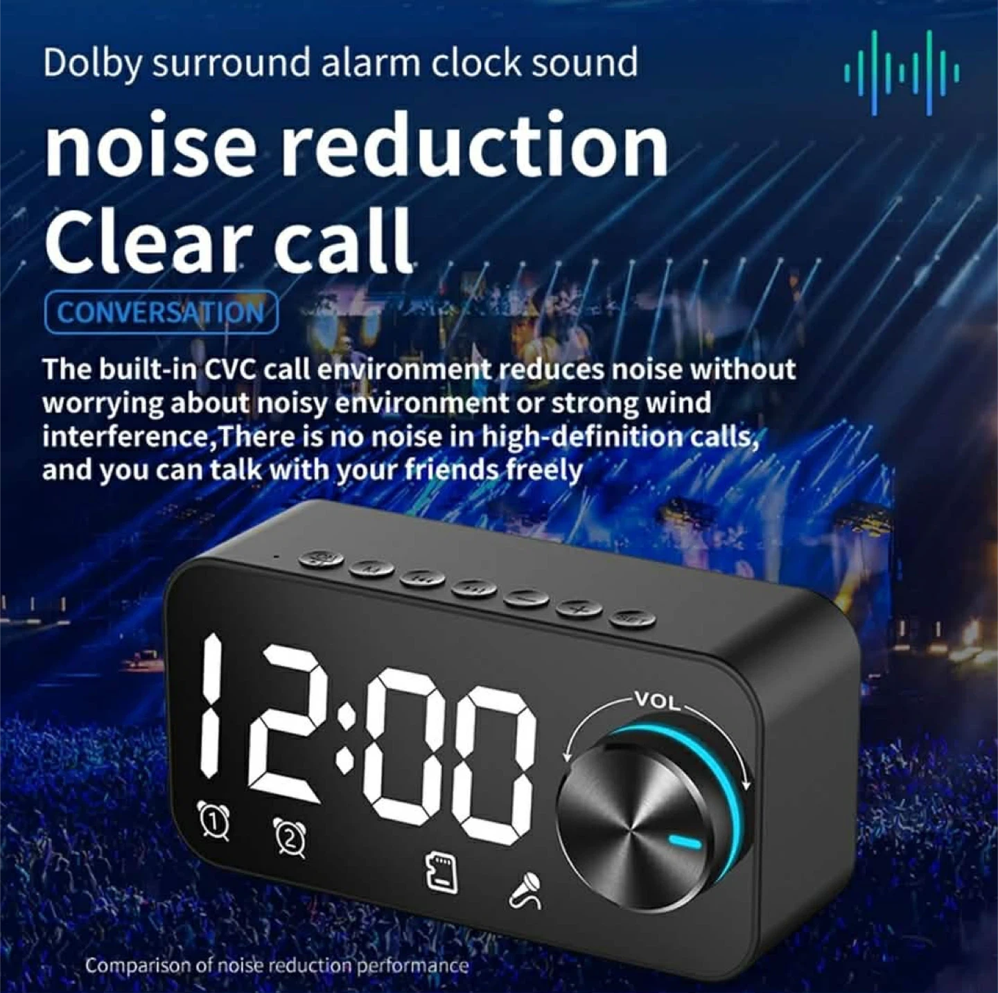 This is a mirror clock wireless speaker. It features a mirror clock display, dual alarms, and real-time temperature. It's available in AUX and memory card modes, and it has a built-in noise-cancelling microphone for high-definition calls. This speaker is useful for waking up on time and taking calls hands-free.