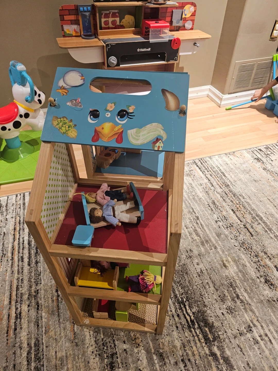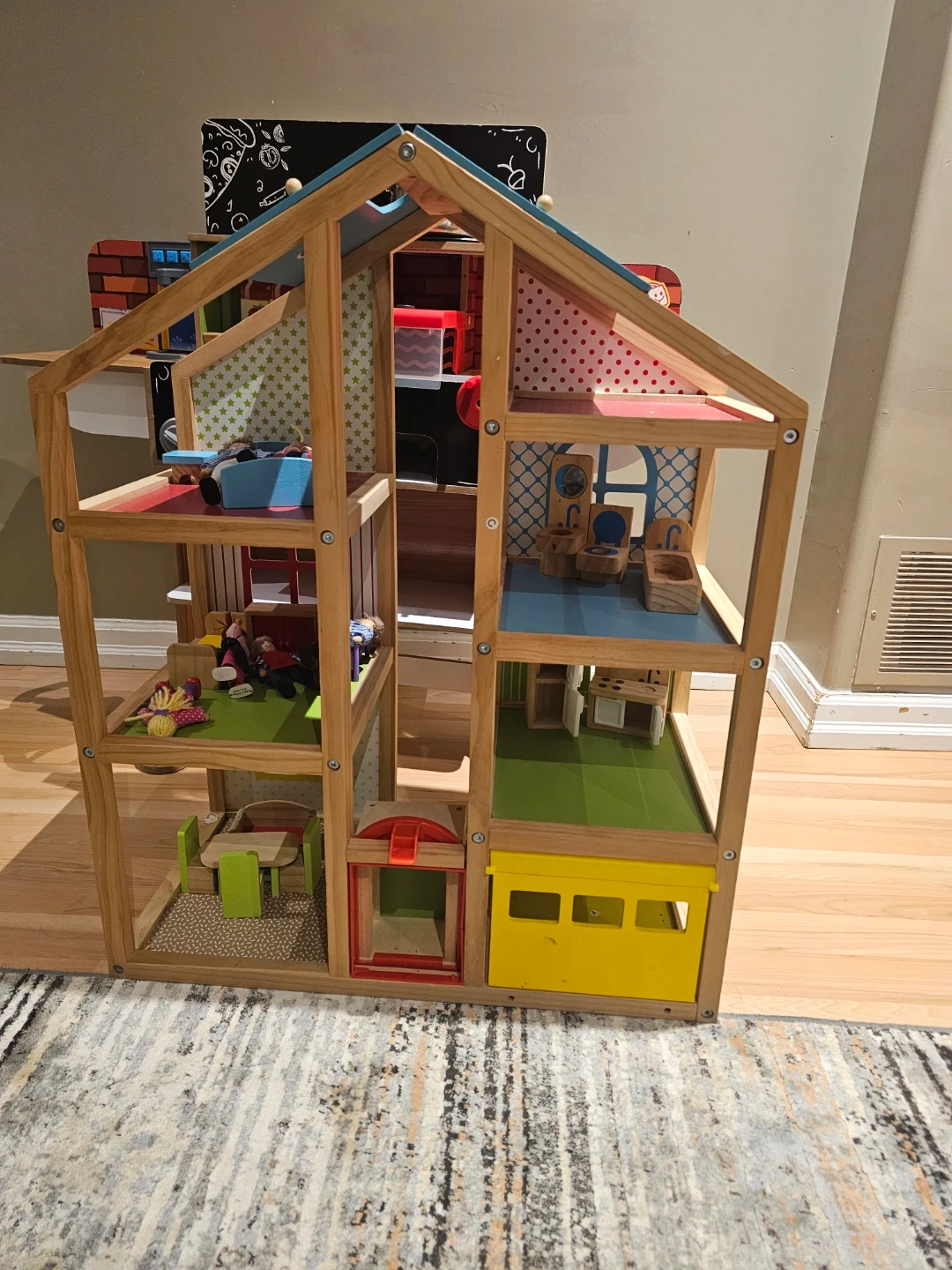 A multi-story wooden dollhouse complete with furniture and figures. It features colourful interior details and a yellow garage door. This dollhouse is great for imaginative play!