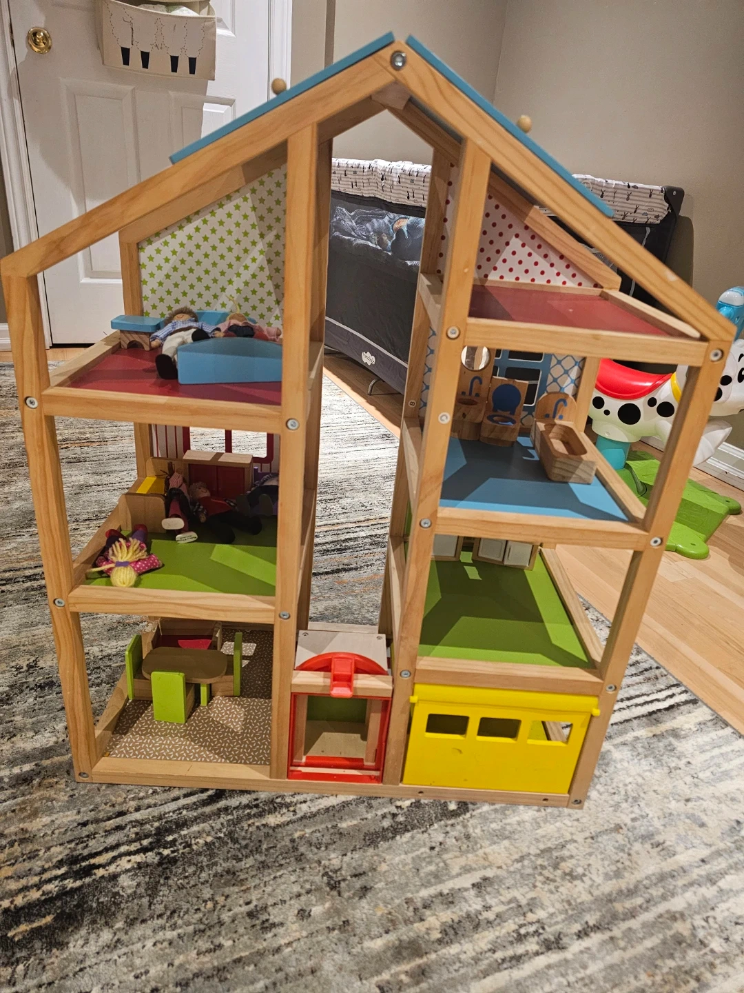 A multi-story wooden dollhouse complete with furniture and figures. It features colourful interior details and a yellow garage door. This dollhouse is great for imaginative play!