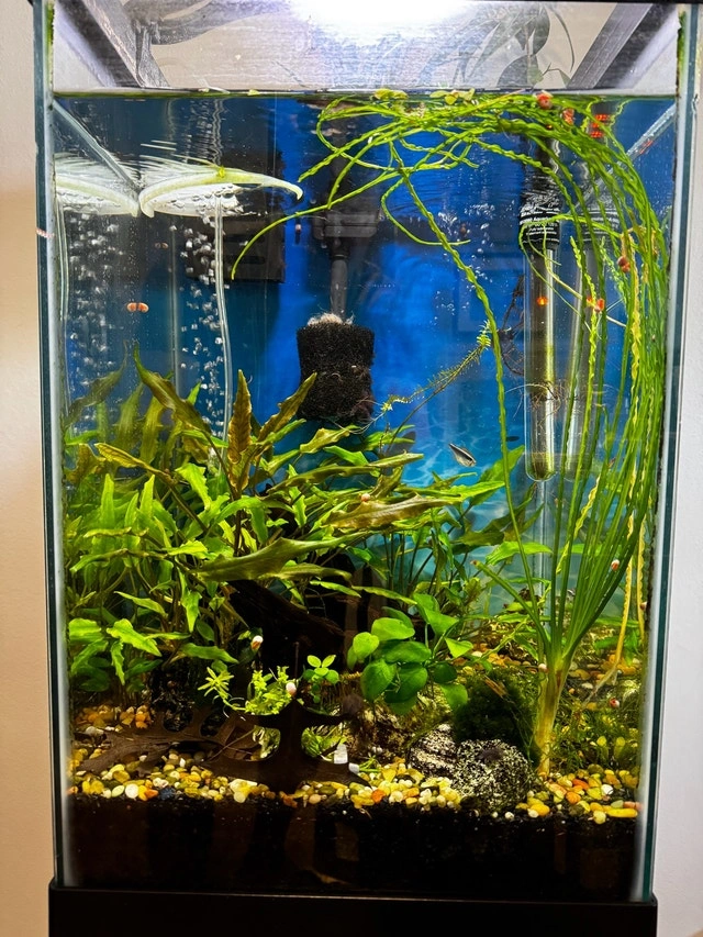 I am selling a complete, fully planted 15 gallon aquarium, perfect for any home or office setup, complete with fish and snails. This setup includes a heater, filter, light, decorative rocks, substrate, and a thriving ecosystem of plants, fish and snails. Specifications: * Tank: 15 gallon tall * Lighting: Integrated LED * Filtration: Multi-stage filtration system * Heating: Adjustable heater * Accessories: Decorative rocks, substrate, thriving plants Given that this setup is used, fully planted, and includes fish and snails, I am asking $250, which is a great value for everything included. If you're reading this, the aquarium is still available!