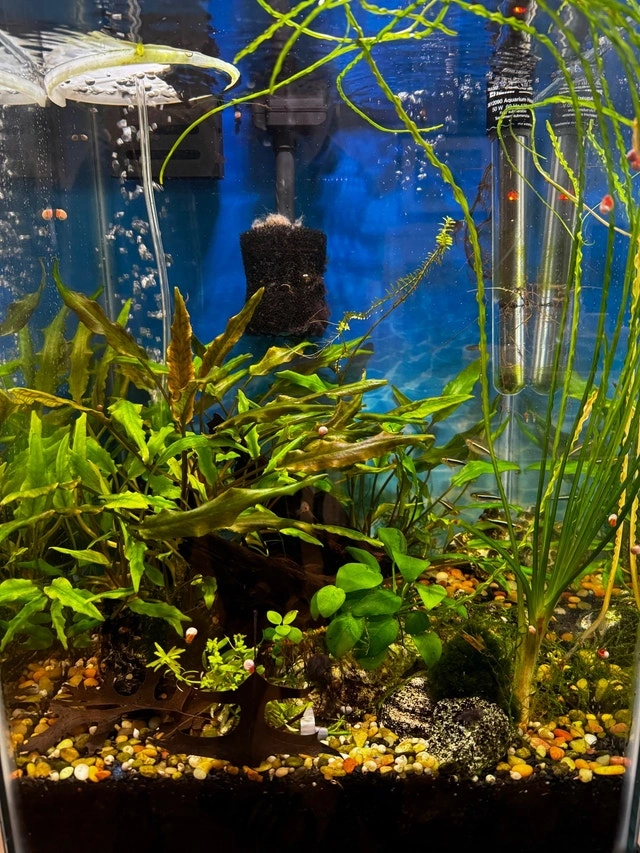 I am selling a complete, fully planted 15 gallon aquarium, perfect for any home or office setup, complete with fish and snails. This setup includes a heater, filter, light, decorative rocks, substrate, and a thriving ecosystem of plants, fish and snails. Specifications: * Tank: 15 gallon tall * Lighting: Integrated LED * Filtration: Multi-stage filtration system * Heating: Adjustable heater * Accessories: Decorative rocks, substrate, thriving plants Given that this setup is used, fully planted, and includes fish and snails, I am asking $250, which is a great value for everything included. If you're reading this, the aquarium is still available!