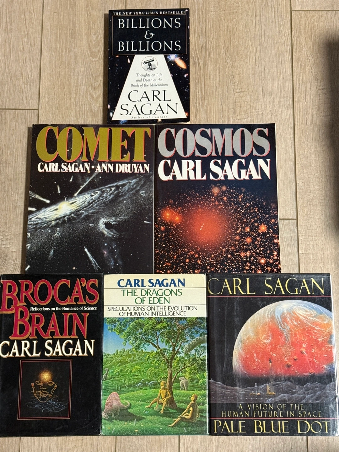 Six books by Carl Sagan. Titles include Billions & Billions, Comet, Cosmos, Broca's Brain, and Pale Blue Dot. Some books co-authored with Ann Druyan.