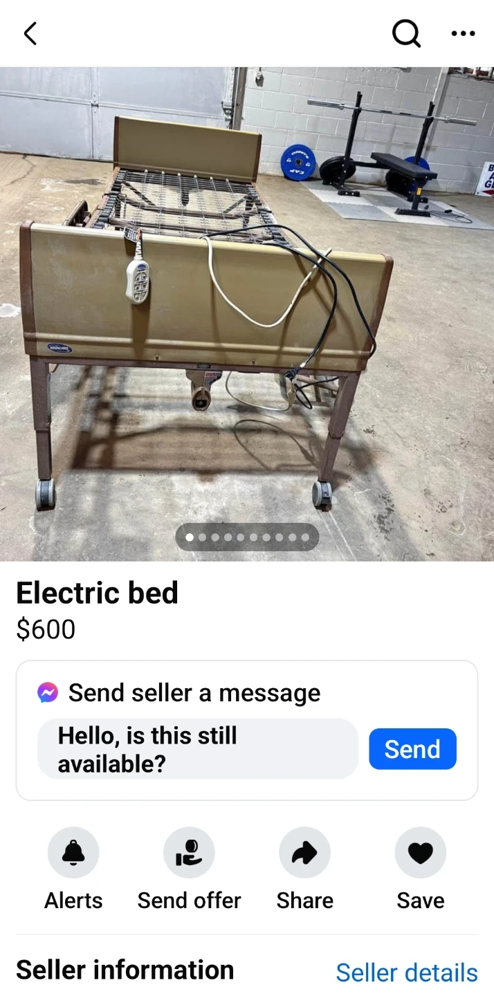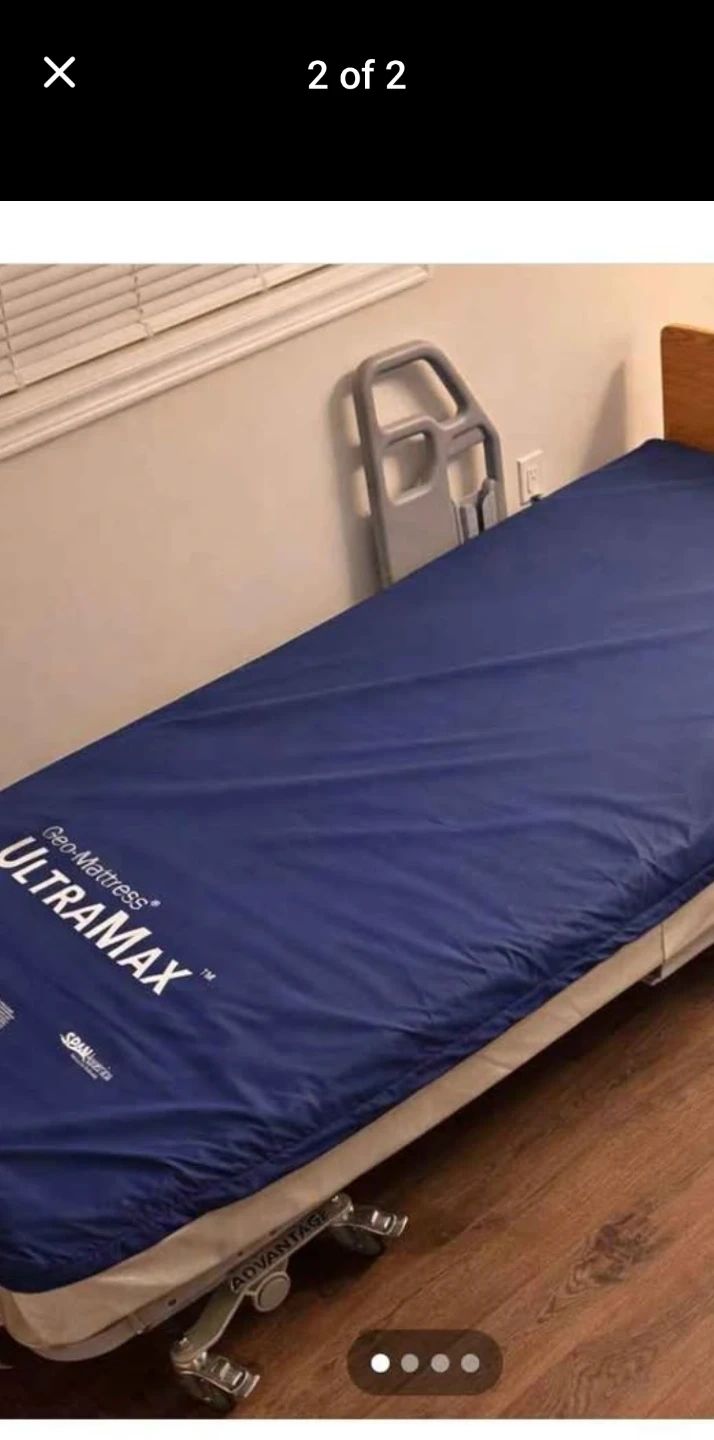 This is an Invacare electric hospital bed. It comes with a Geo-Mattress Ultramax. The bed is adjustable with a hand controller. It has wheels for easy movement.