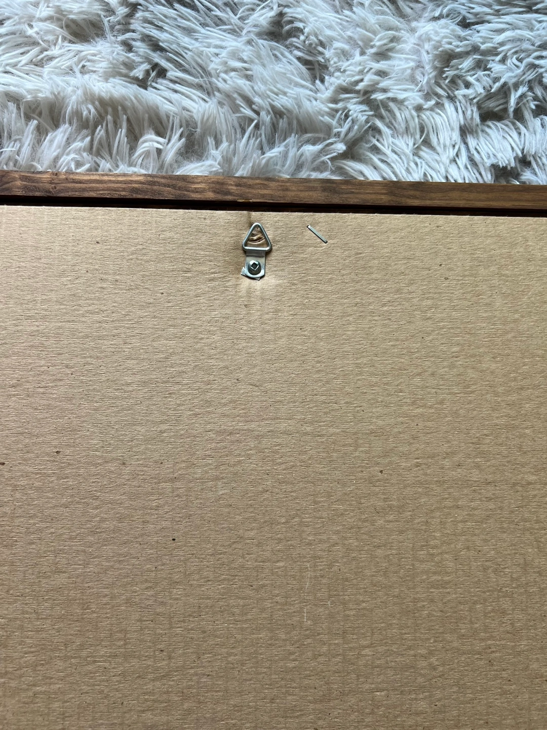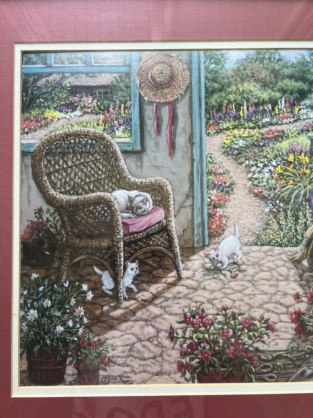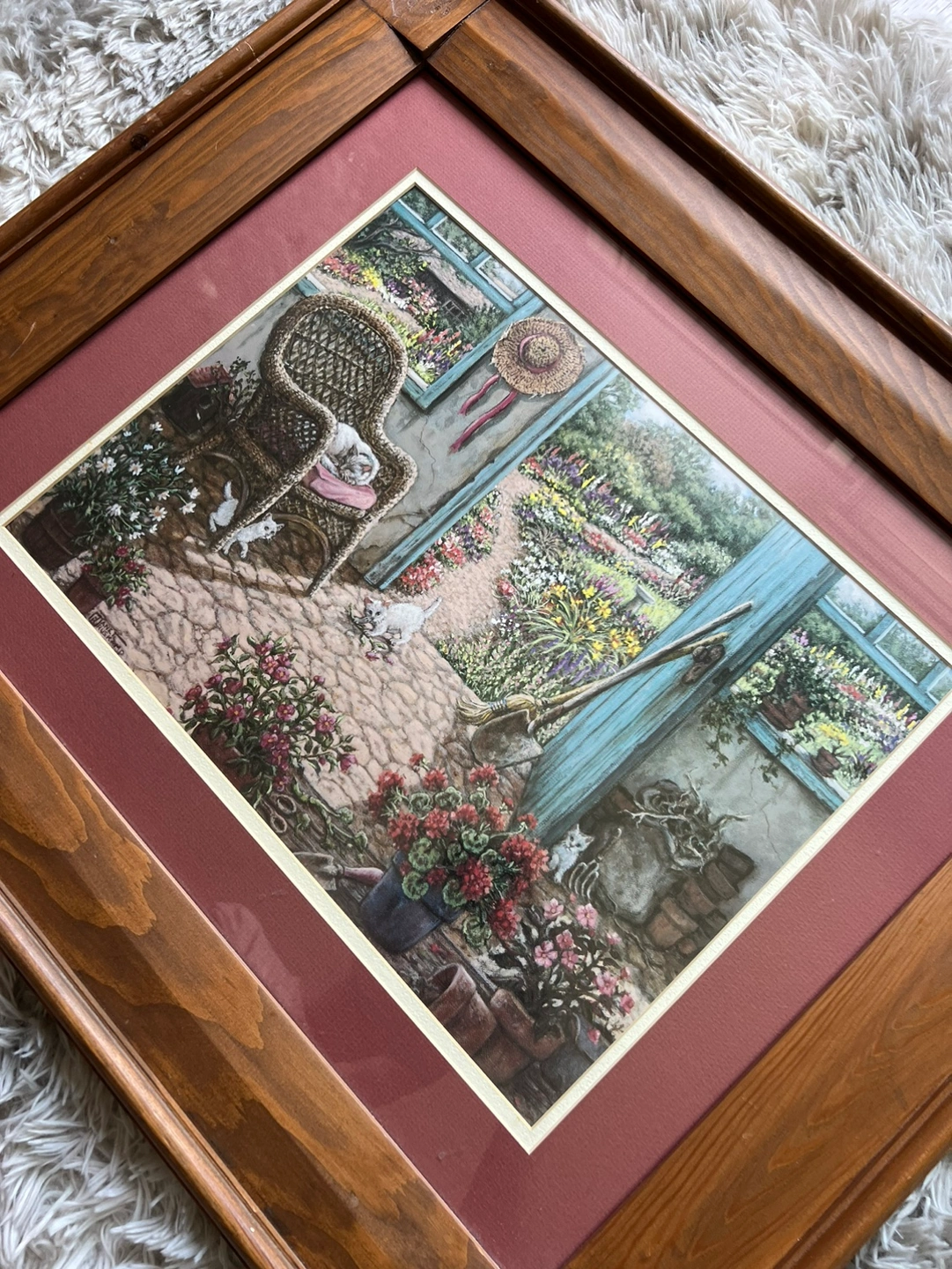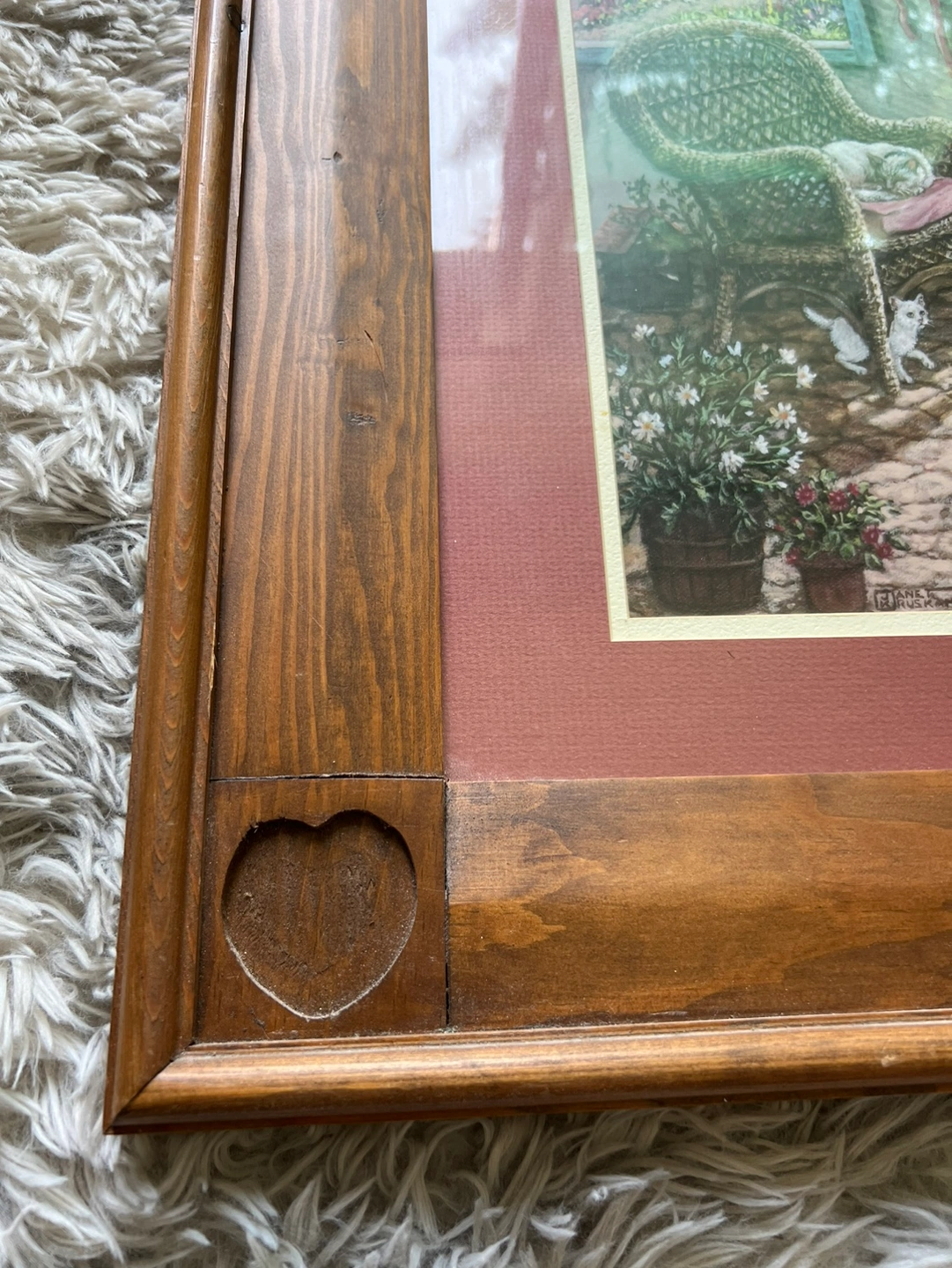 A framed print featuring a cat asleep in a wicker chair with two kittens playing. The print is surrounded by flowers and greenery. The frame is a rustic brown wood with heart shaped accents.