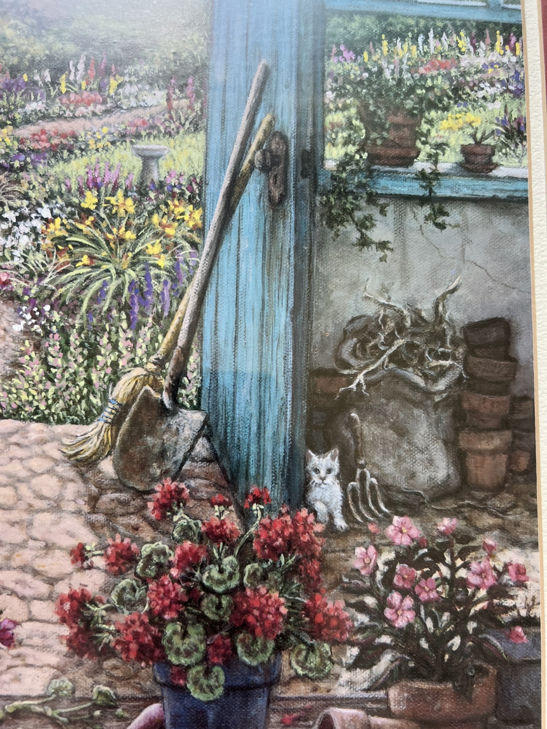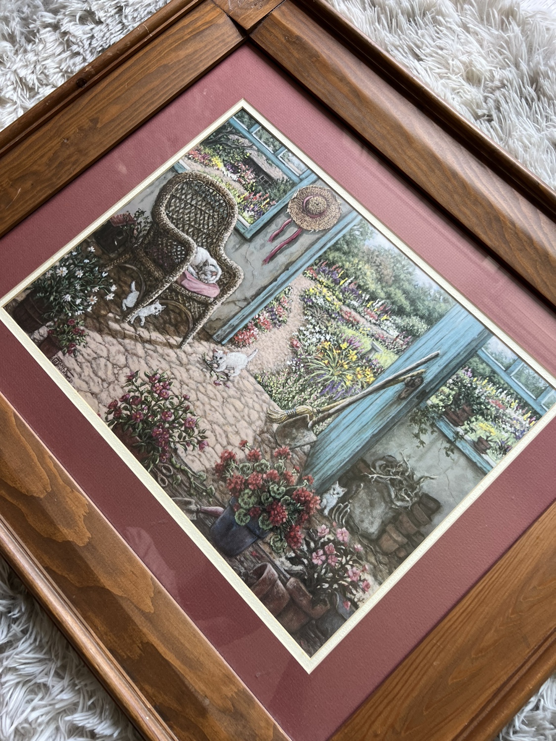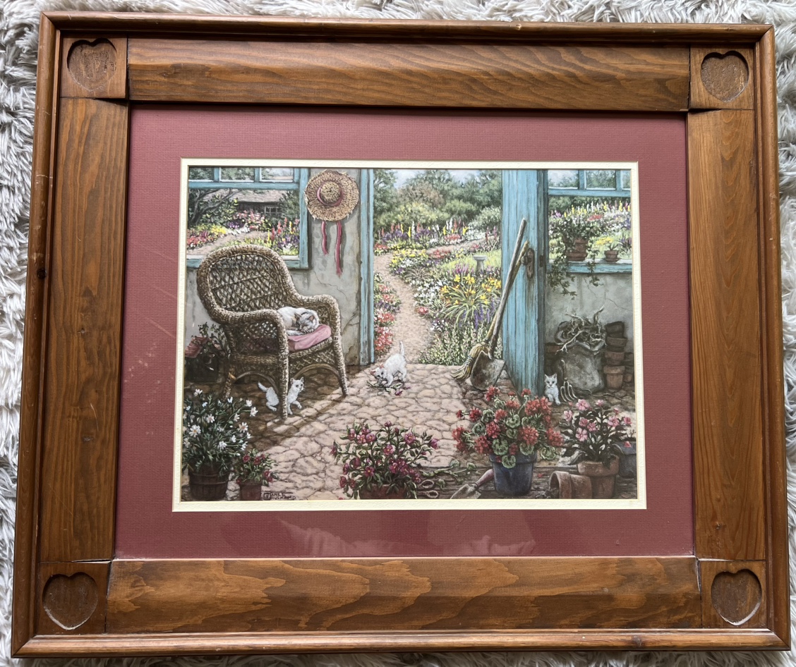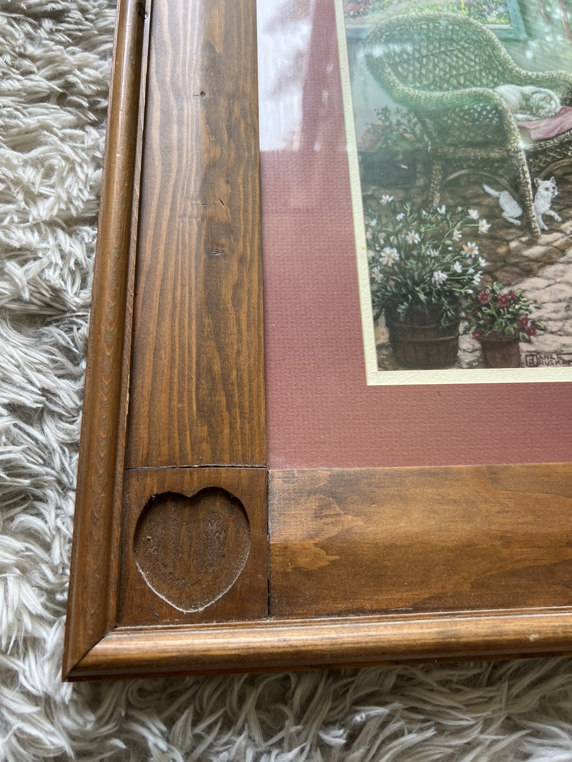 A framed print featuring a cat asleep in a wicker chair with two kittens playing. The print is surrounded by flowers and greenery. The frame is a rustic brown wood with heart shaped accents.