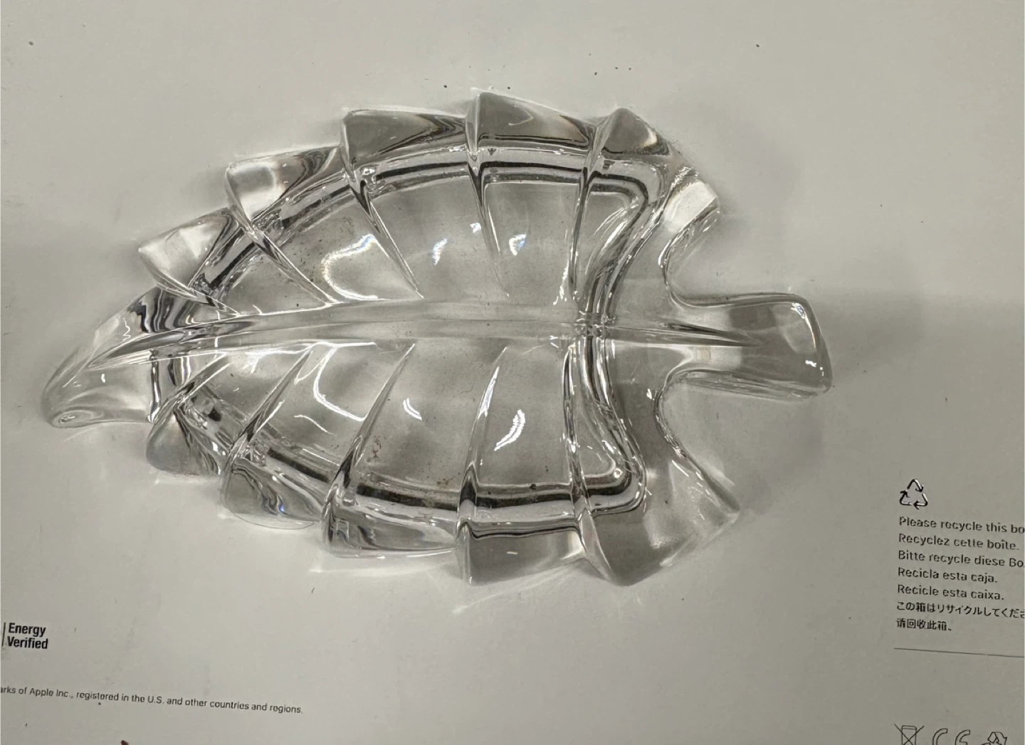 Elegant clear glass dish in a leaf shape, perfect for serving or display.