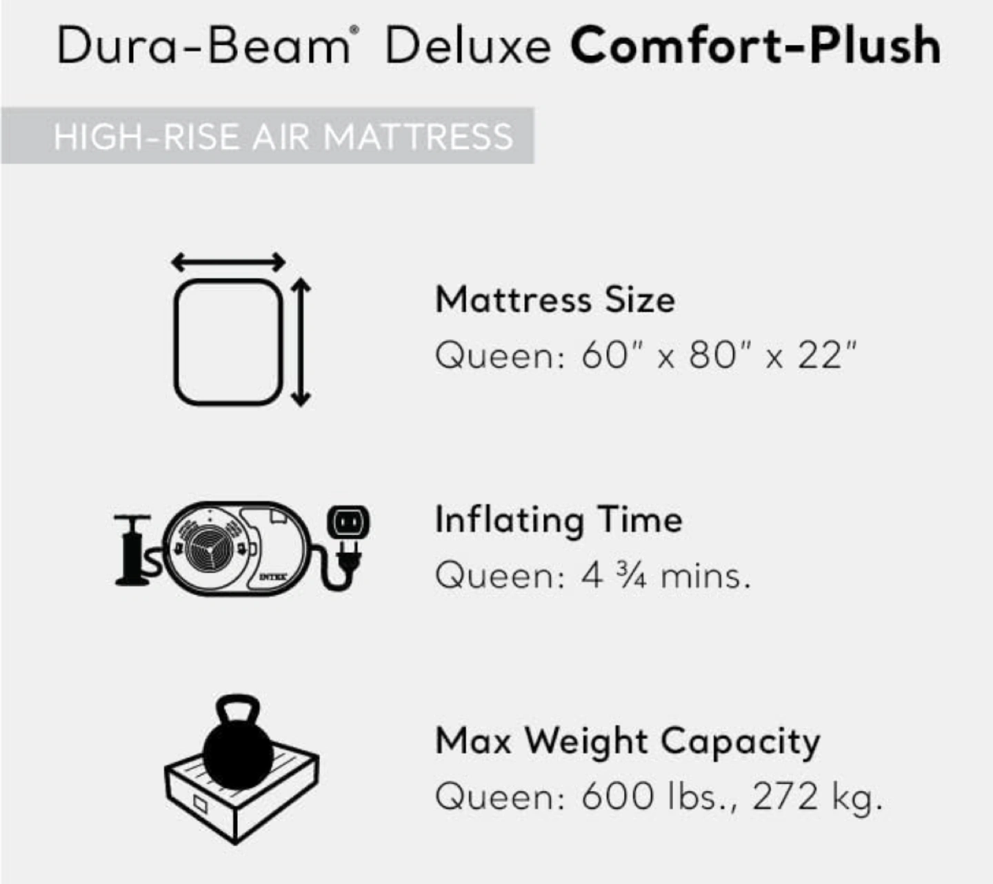 INTEX 64417ED Dura-Beam Deluxe Comfort-Plush High-Rise Air Mattress: Fiber-Tech – Queen Size – Built-in Electric Pump – 22in Bed Height – 600lb Weight Capacity
